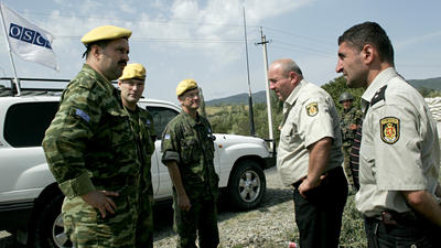 The routine patrol, travelling in a armoured vehicle clearly identified with the letters "OSCE", came under fire after two unidentified men in camouflage uniform emerged from bushes close to the track and began shooting with sub-machine guns. The incident took place west of Kvemo Khviti and east of the administrative border line. There were no OSCE casualties.