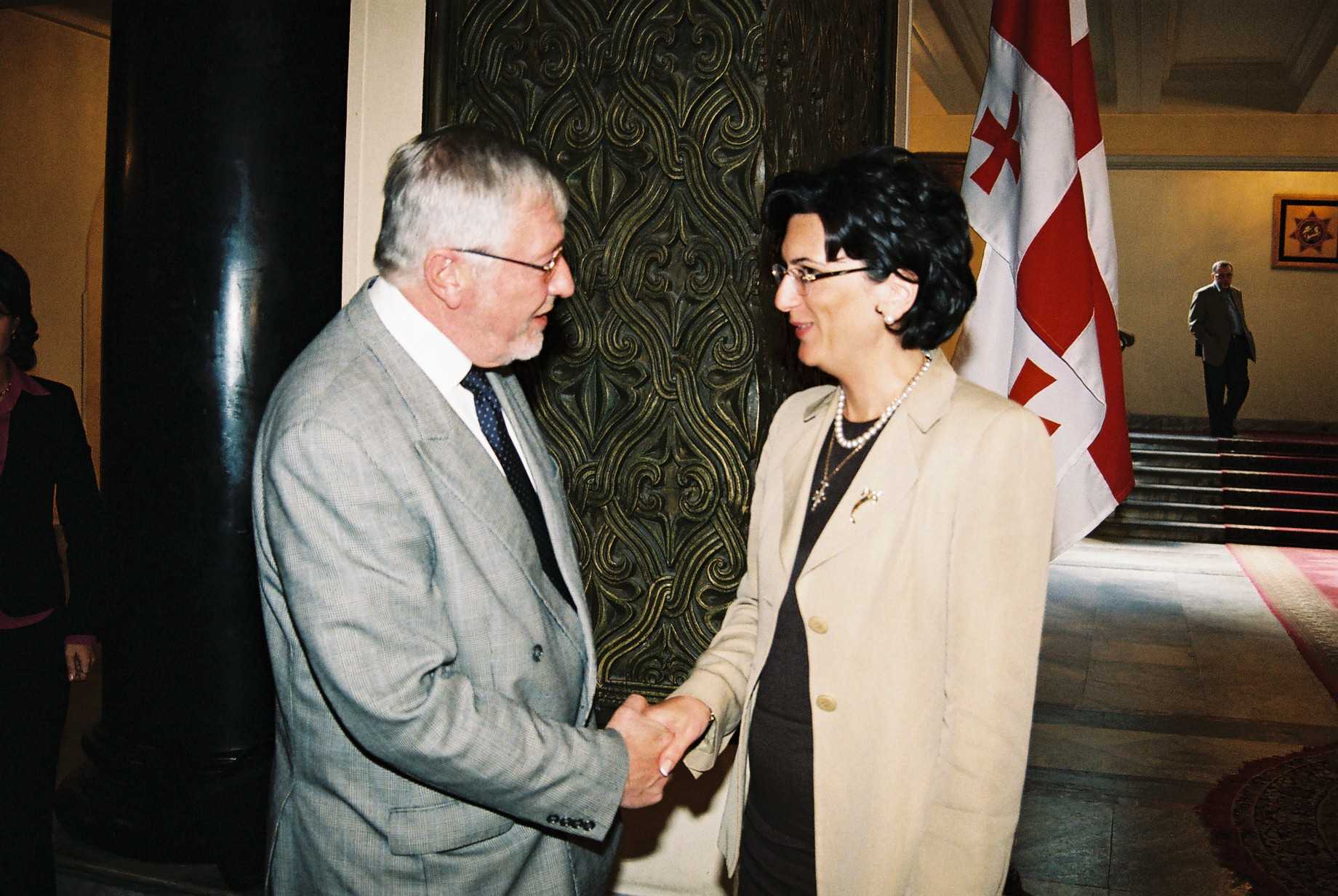 Head of Mission Roy Reeve and Chairperson of the Georgian Parliament Nino Burjanadze at the signing of the Parliament's Code of Conduct, 12 October 2004. The Mission supported the development of the Code in response to calls from Georgia's Parliament.