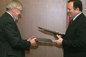 Head of the OSCE Mission to Georgia, Ambassador Roy Reeve (left), and Georgian Minister of Justice, Constantine Kemularia, at the signing of an agreement to start implementing a reform project for the civil registry system, Tbilisi, 17 October 2005.