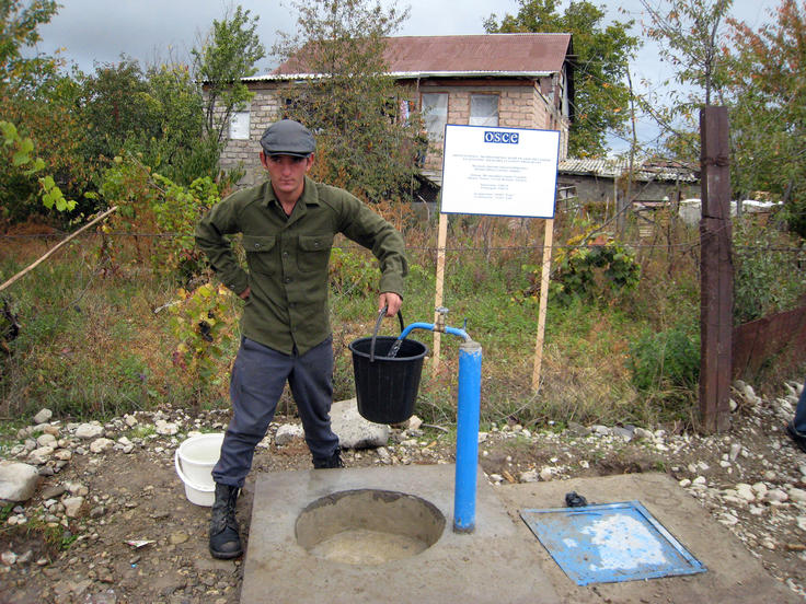 A local villager gets water, 16 October 2007. Tap drinking water is now available in Georgian and Ossetian villages around Ksuisi as part of the OSCE economic rehabilitation programme for the zone of conflict, a project funded by Turkey and the UK.