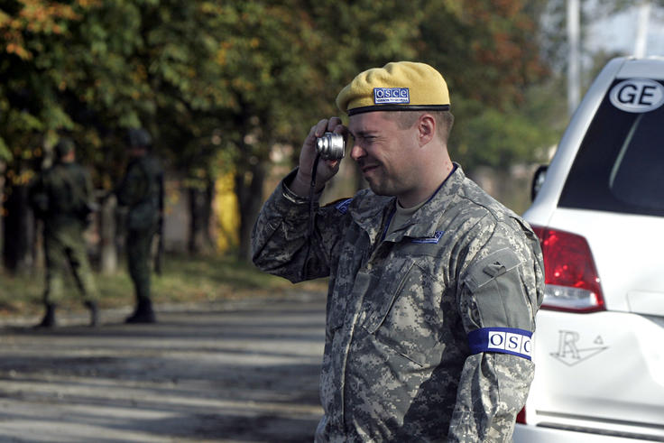 A military monitoring officer from the OSCE Mission to Georgia photographs the withdrawal of Russian troops, 8 October 2008.