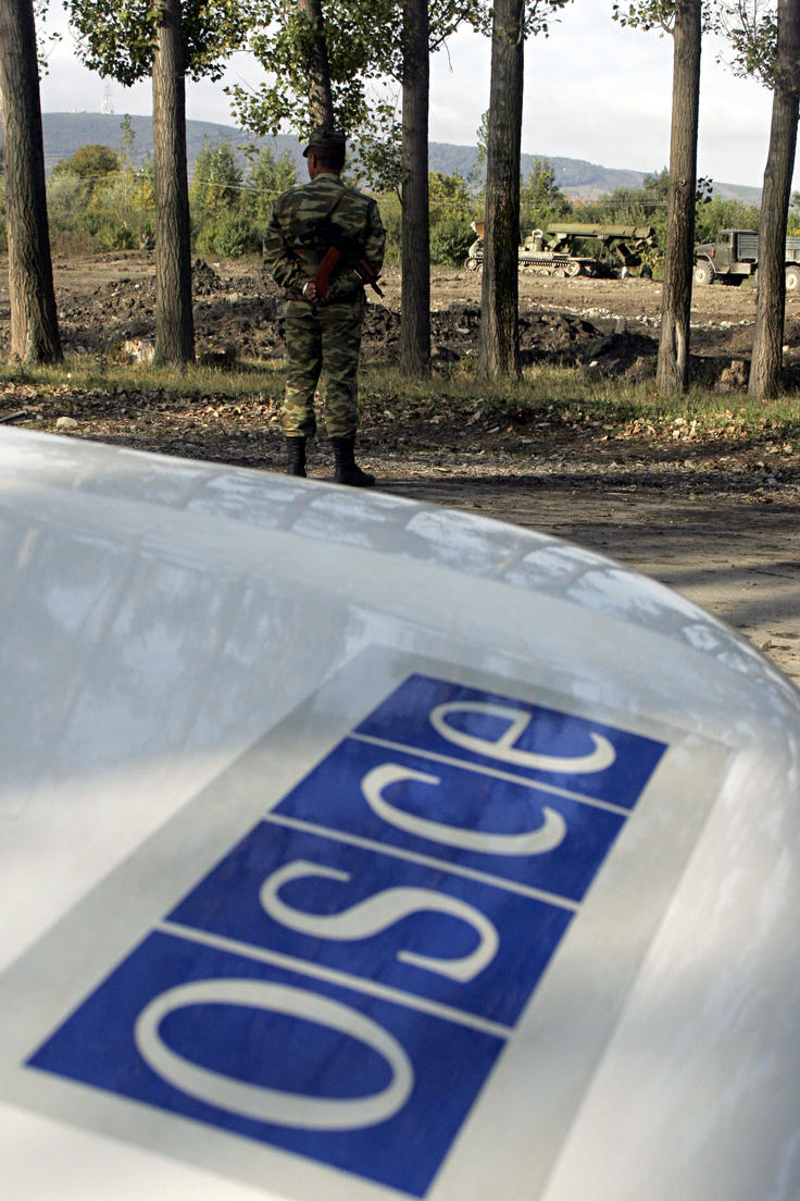 A vehicle belonging to military monitoring officers from the OSCE Mission to Georgia parked on the road as the officers observe the withdrawal of Russian troops, 8 October 2008.