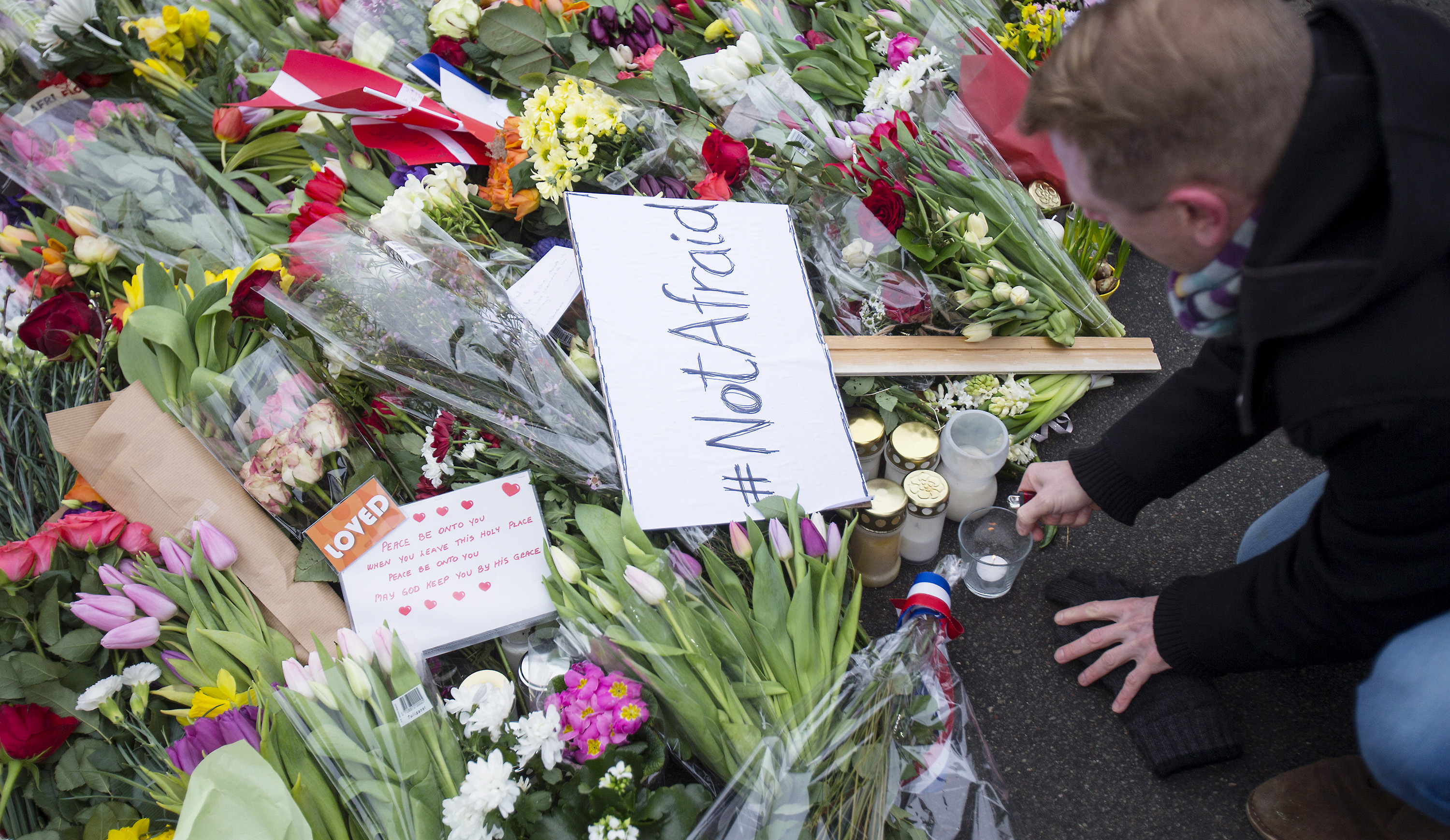 A man places a candle at the scene of a shooting at cafe 'Krudttonden,' which was hosting a free speech event, in Oesterbro, Copenhagen, February 16, 2015.