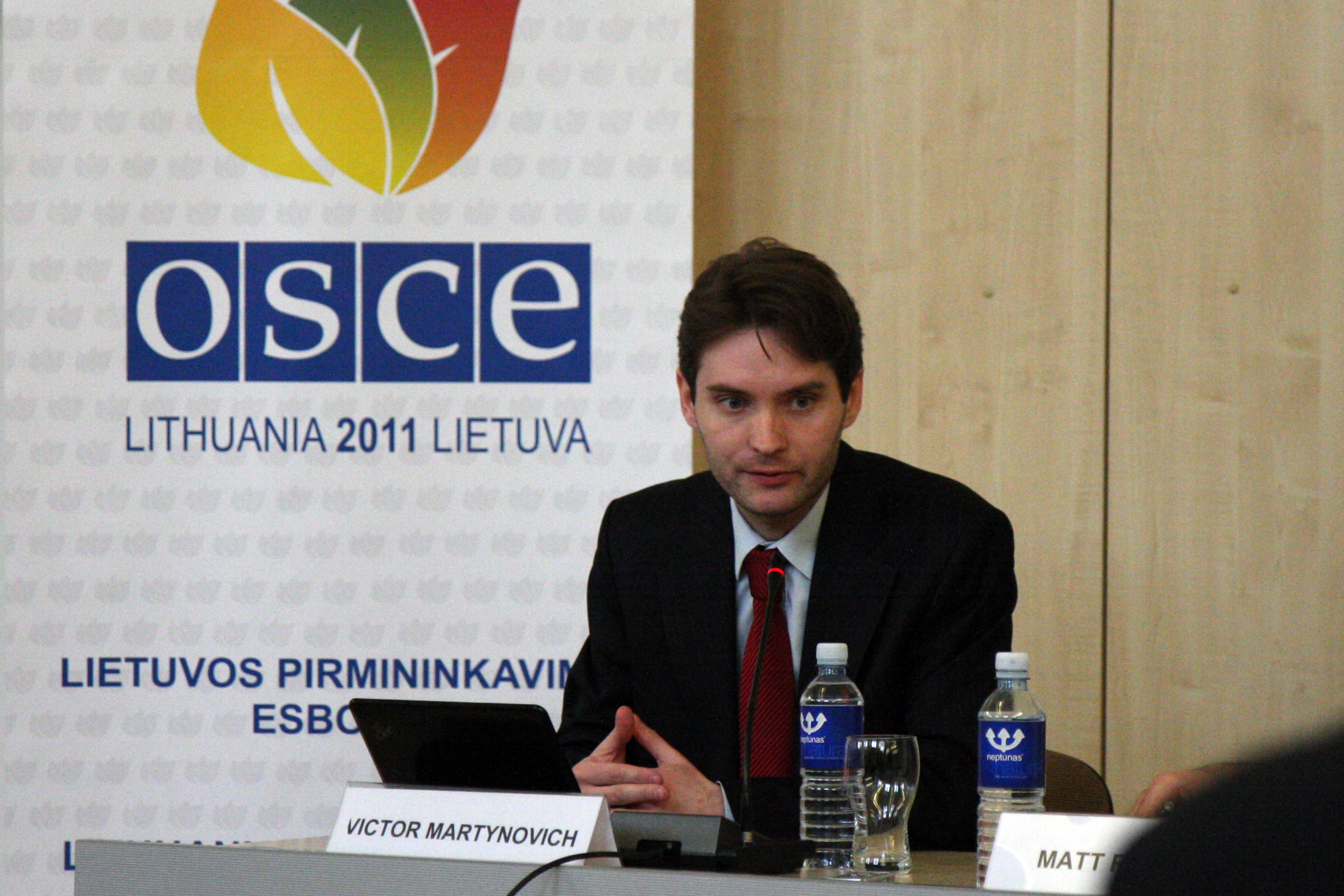 Viktor Martynovich of the European Humanities University speaks during an OSCE Talks event in Vilnius, 5 April 2011.