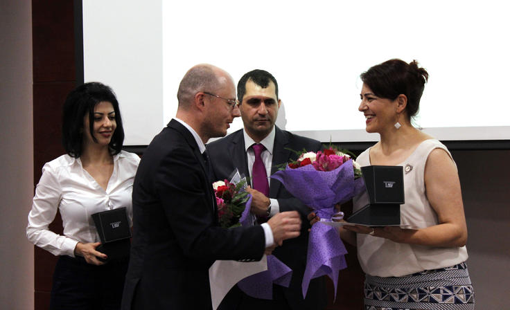 ԵԱՀԿ երևանյան գրասենյակի ժողովրդավարացման ծրագրի ղեկավար Դեյվիդ Գուլետտը հանձնում է մրցանակ Հայաստանի կանանց ռեսուրս-կենտրոնների ցանցի (WINNET Հայաստան) նախագահ Ռուզաննա Տոռոզյանին «2016թ. լավագույն կին գործարար» ամենամյա մրցանակաբաշխութան ընթացքում. Երևան, 2016թ. հունիսի 29: