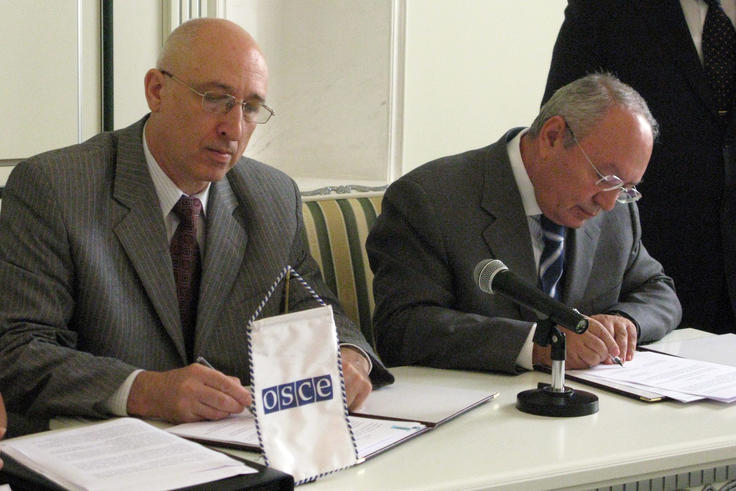 Head of the OSCE Office in Yerevan Ambassador Sergey Kapinos (l) and Armenian Prosecutor General Aghvan Hovsepyan sign a co-operation agreement on prosecutorial reform, Yerevan, 24 August 2011.