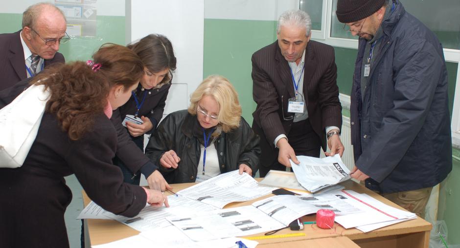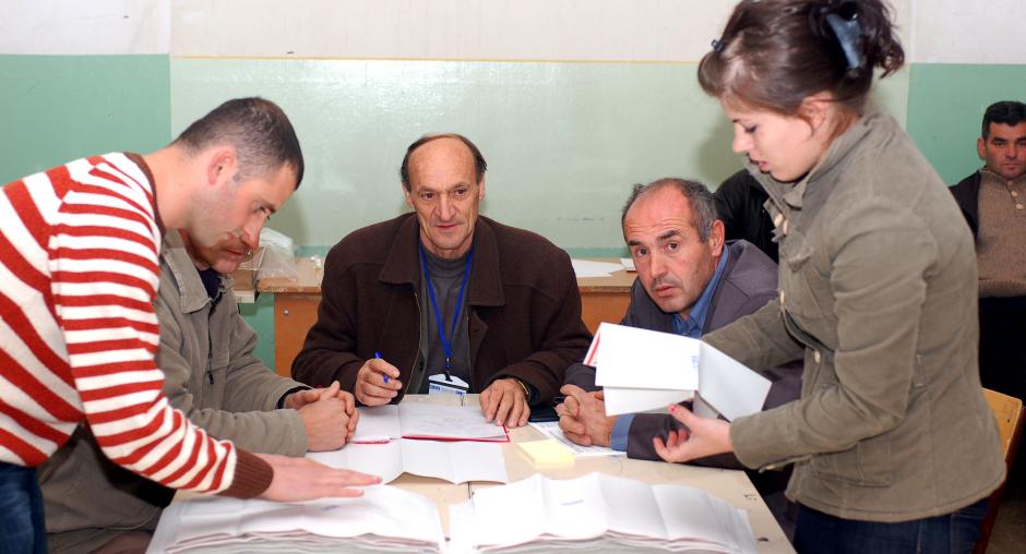 Members of the polling station at "Vellezerit Frasheri" Primary School, Bukosh village in Suhareke/Suva Reka Municipality, start counting the ballots from Kosovo's elections on 17 November 2007. (OSCE/Hasan Sopa)