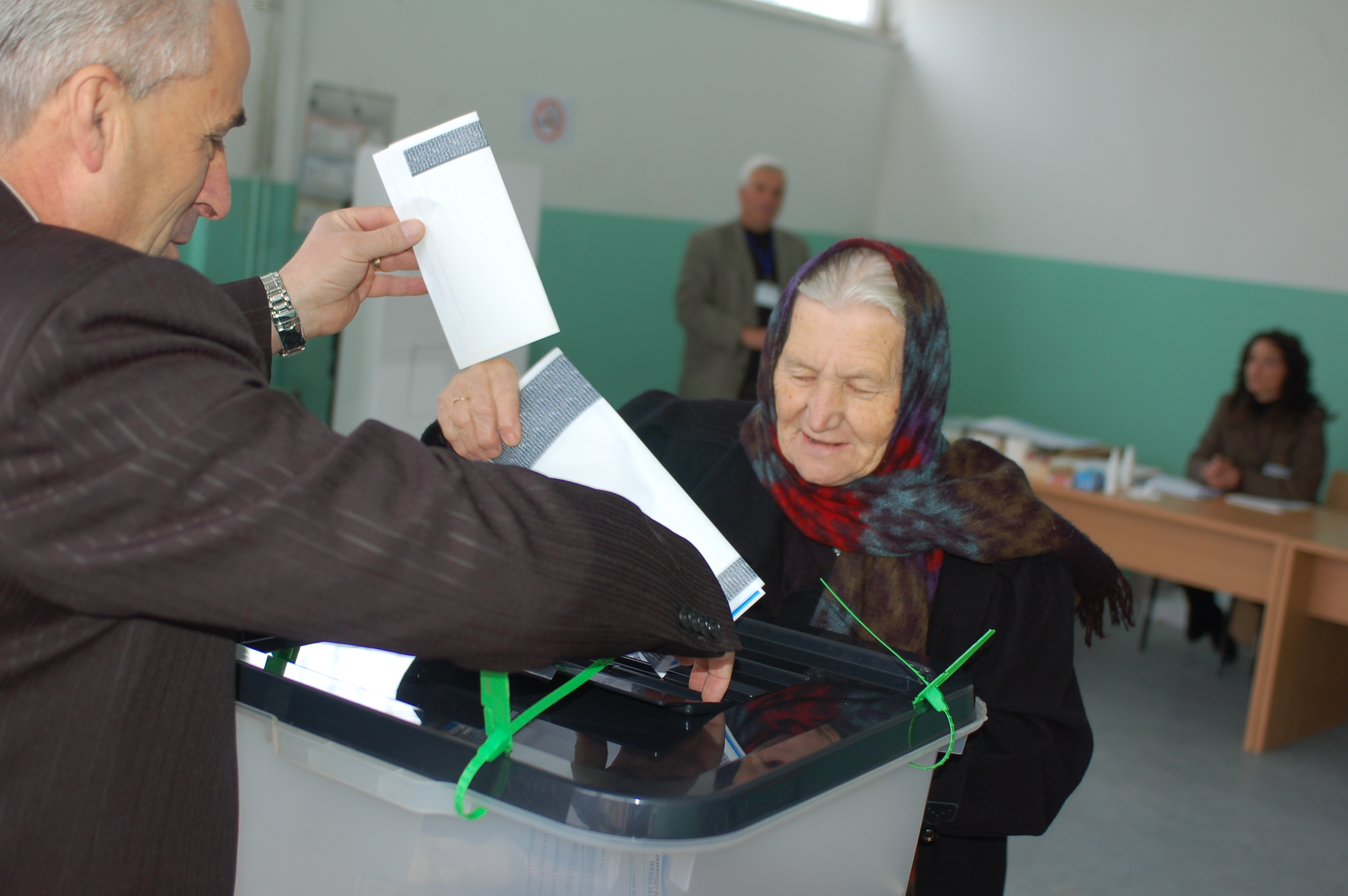 A voter casts her ballot at "Jeta Re" secondary school polling station in Suhareke/Suvareka municipality, Kosovo, 17 November 2007.