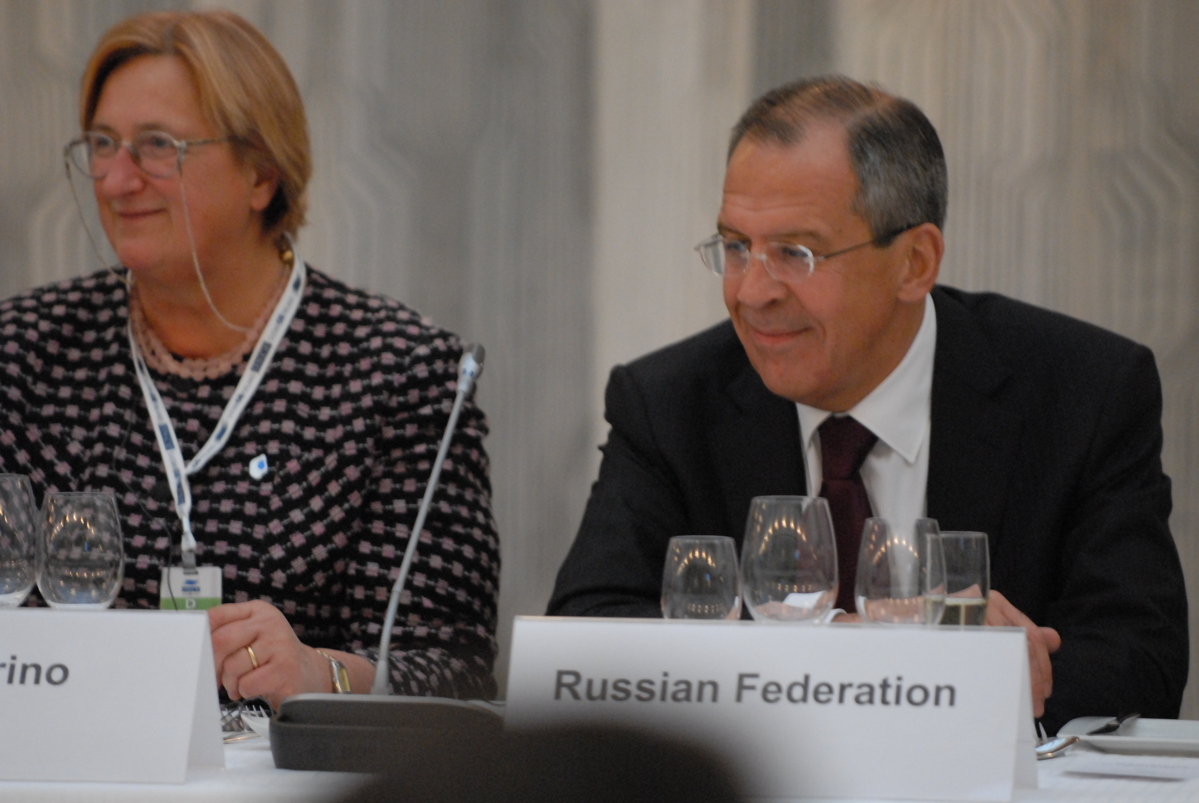 Foreign Ministers of San Marino and Russian Federation, Fausta Morganti (left) and Sergey Lavrov (right), during the working lunch on the first day of the 16th OSCE Ministerial Council in Helsinki, 4 December 2008.
