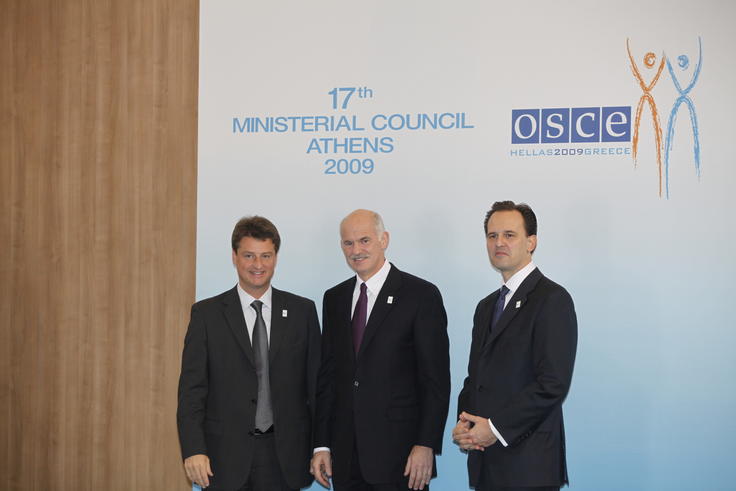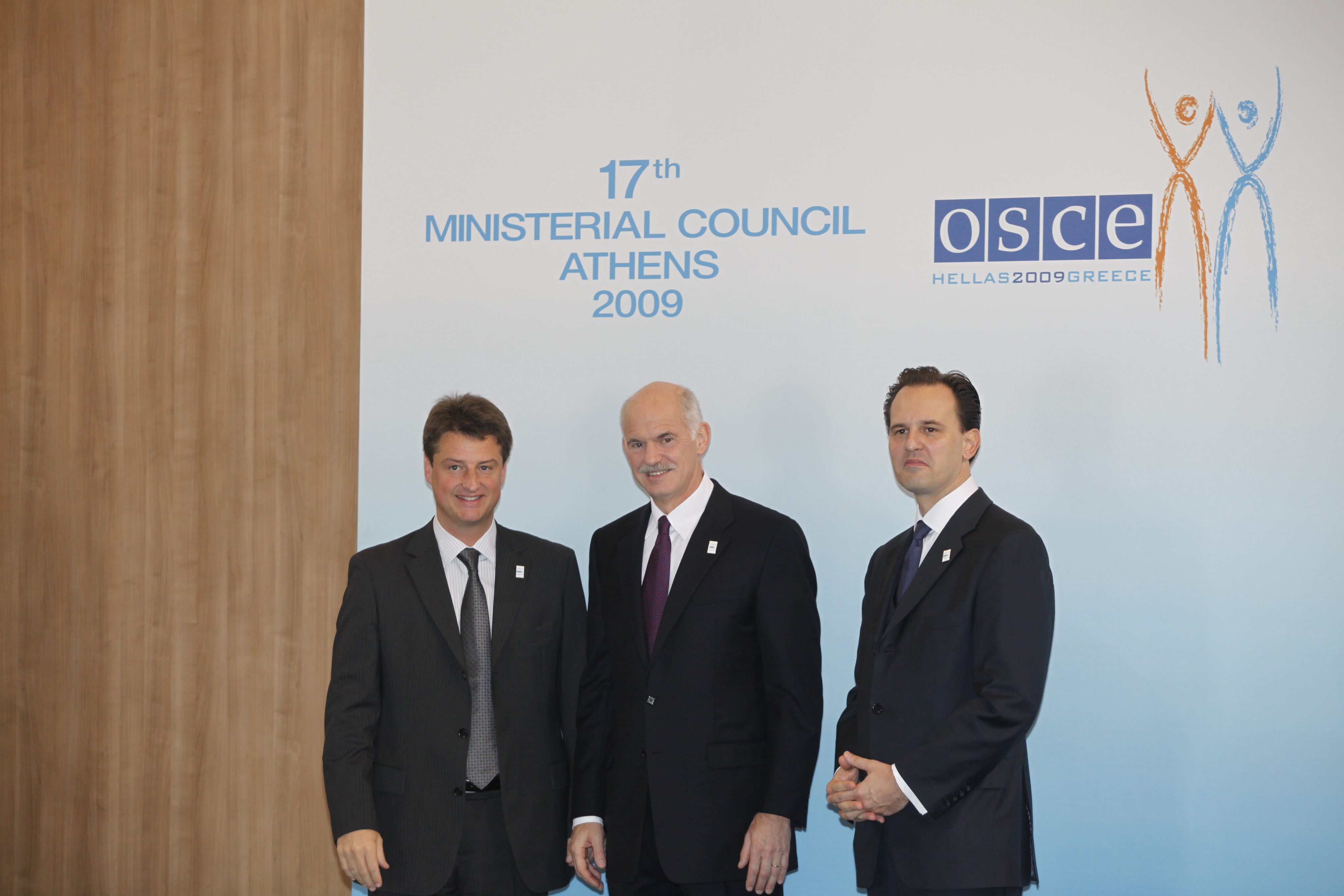 Belgium's State Secretary for European and Foreign Affairs Chastel Olivier (l) with Greek Prime Minister and OSCE CiO George Papandreou and Alternate Foreign Minister Dimitris Droutsas at the 17th OSCE Ministerial Council, Athens, 1 December 2009.