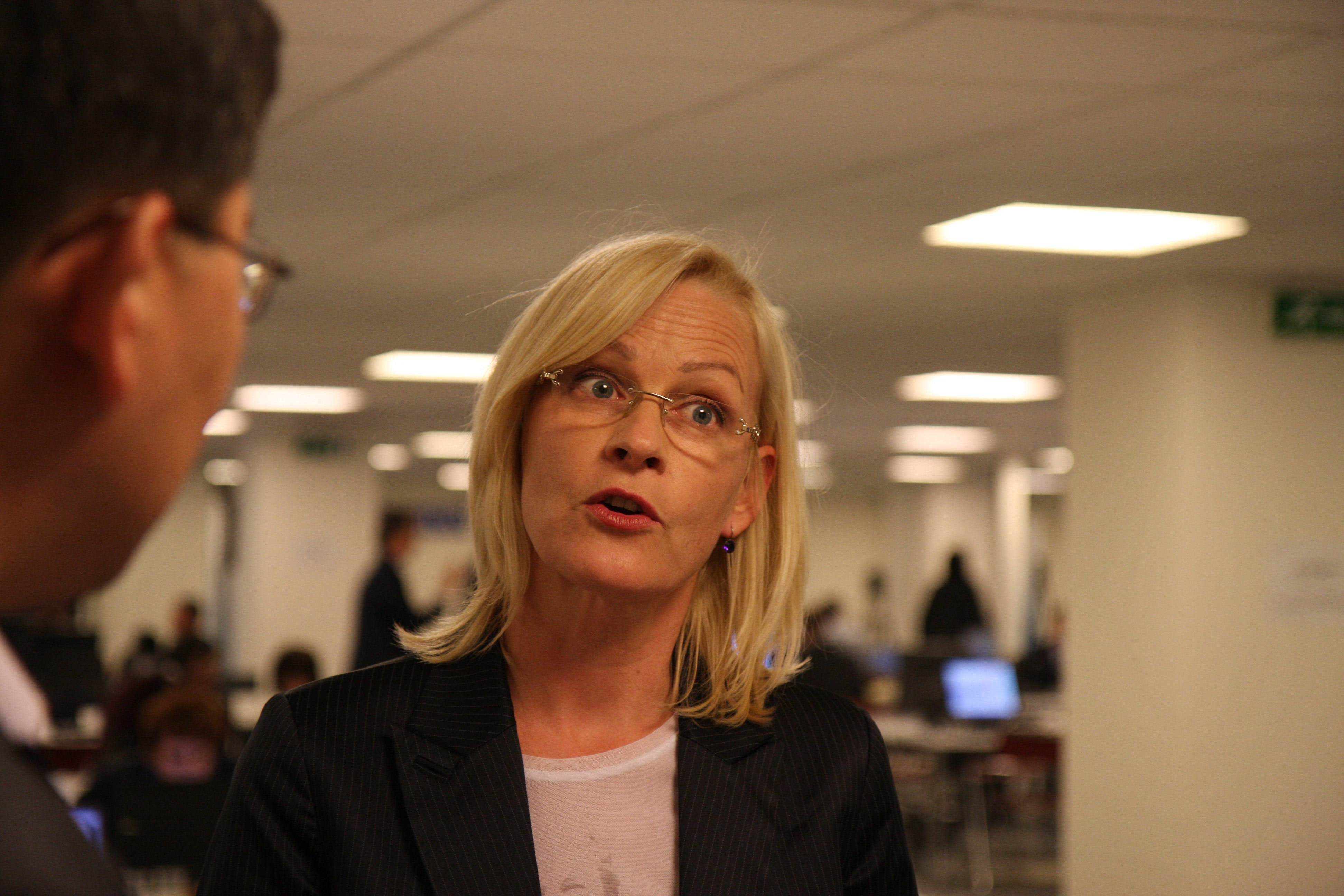 OSCE Special Representative for Combating Trafficking in Human Beings Eva Biaudet is interviewed by a Kazakh journalist at the 17th OSCE Ministerial Council in Athens, 1 December 2009.