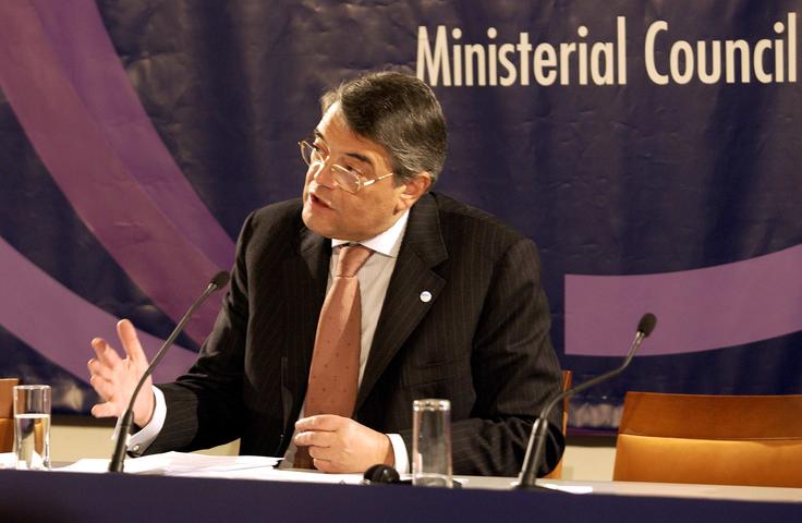 The OSCE Chairman-in-Office, Portuguese Foreign Minister Antonio Martins da Cruz, at a press conference during the Ministerial Council in Porto, 6 December 2002.