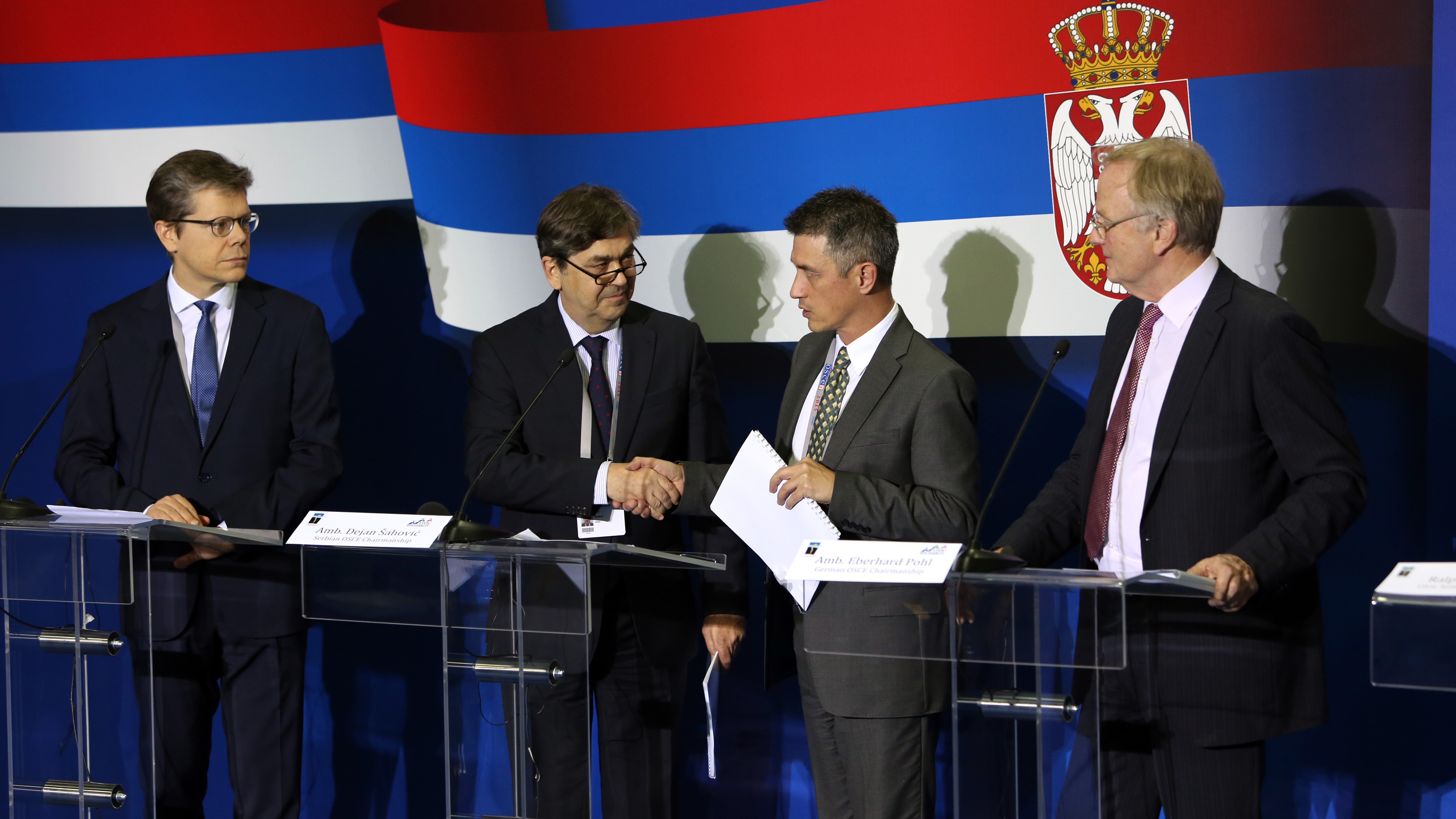 The recommendations of the 2015 OSCE Parallel Civil Society Conference, organized by the Civic Solidarity Platform, are handed over by Ralph du Long to Ambassador Dejan Šahović, Head of the Task Force for the OSCE Chairmanship of Serbia and representatives of the OSCE Troika, Belgrade, 2 December 2015.