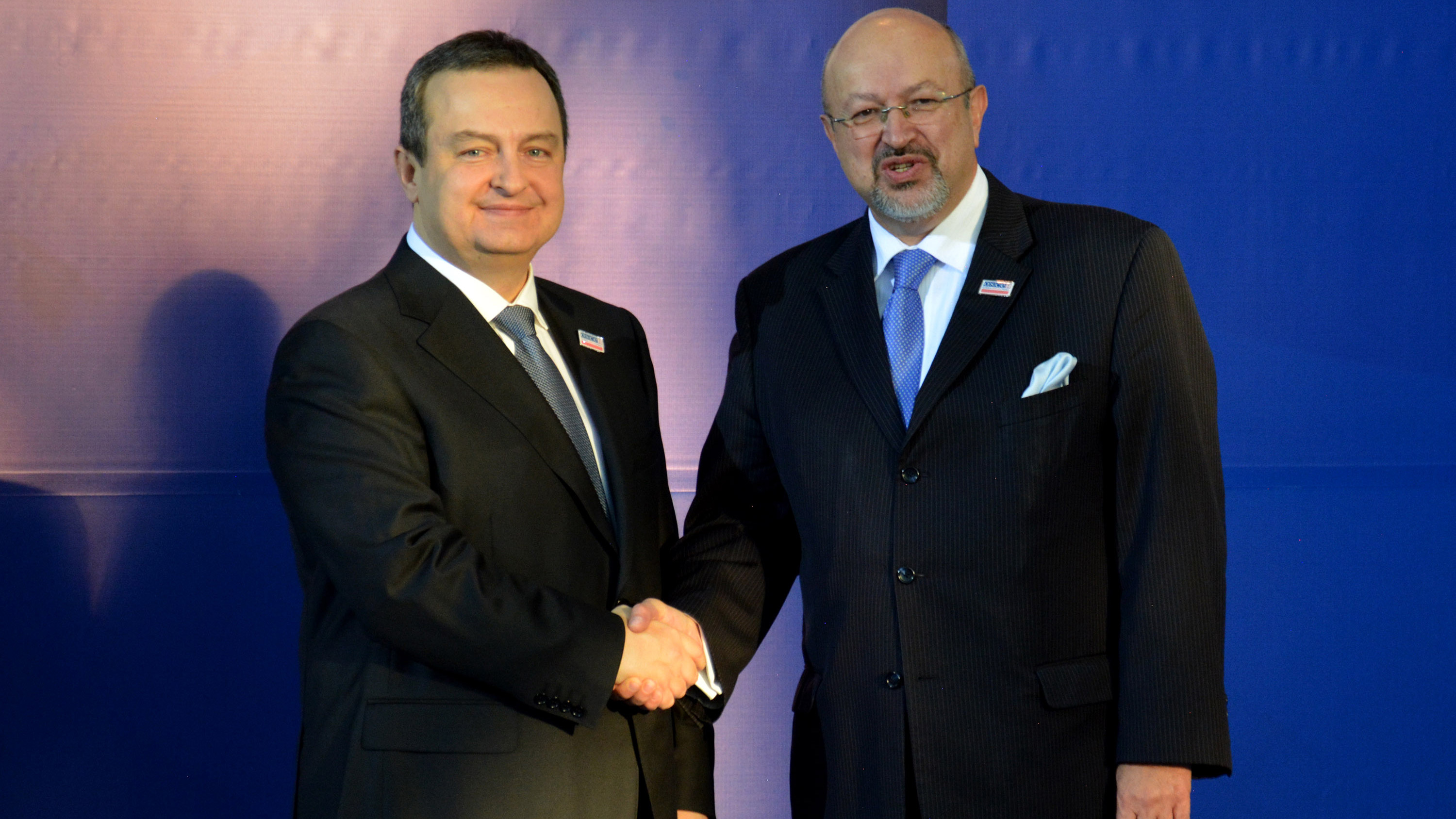OSCE Chairperson-in-Office, Serbia’s Foreign Minister Ivica Dačić, greets Secretary General Zannier at the start of the 22nd OSCE Ministerial Council in Belgrade, 3 December 2015.