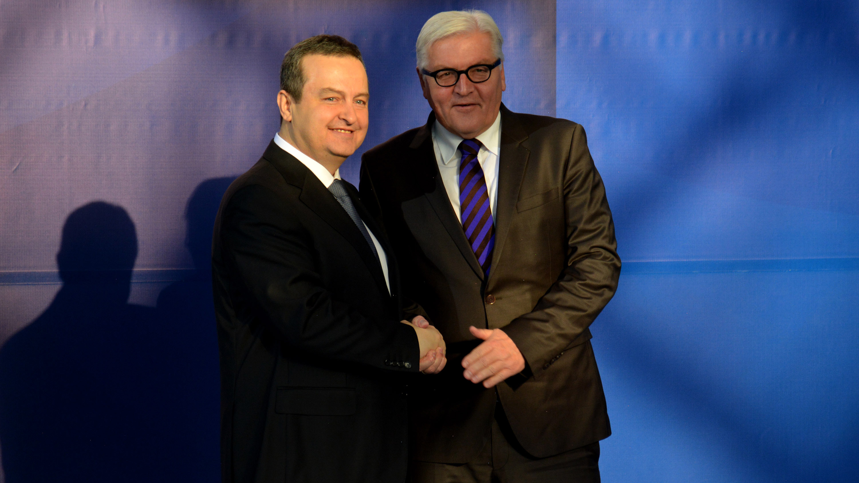 OSCE Chairperson-in-Office, Serbia’s Foreign Minister Ivica Dačić, greets the incoming OSCE Chairperson-in-Office, German Minister of Foreign Affairs Frank-Walter Steinmeier, at the start of the 22nd OSCE Ministerial Council in Belgrade, 3 December 2015.
