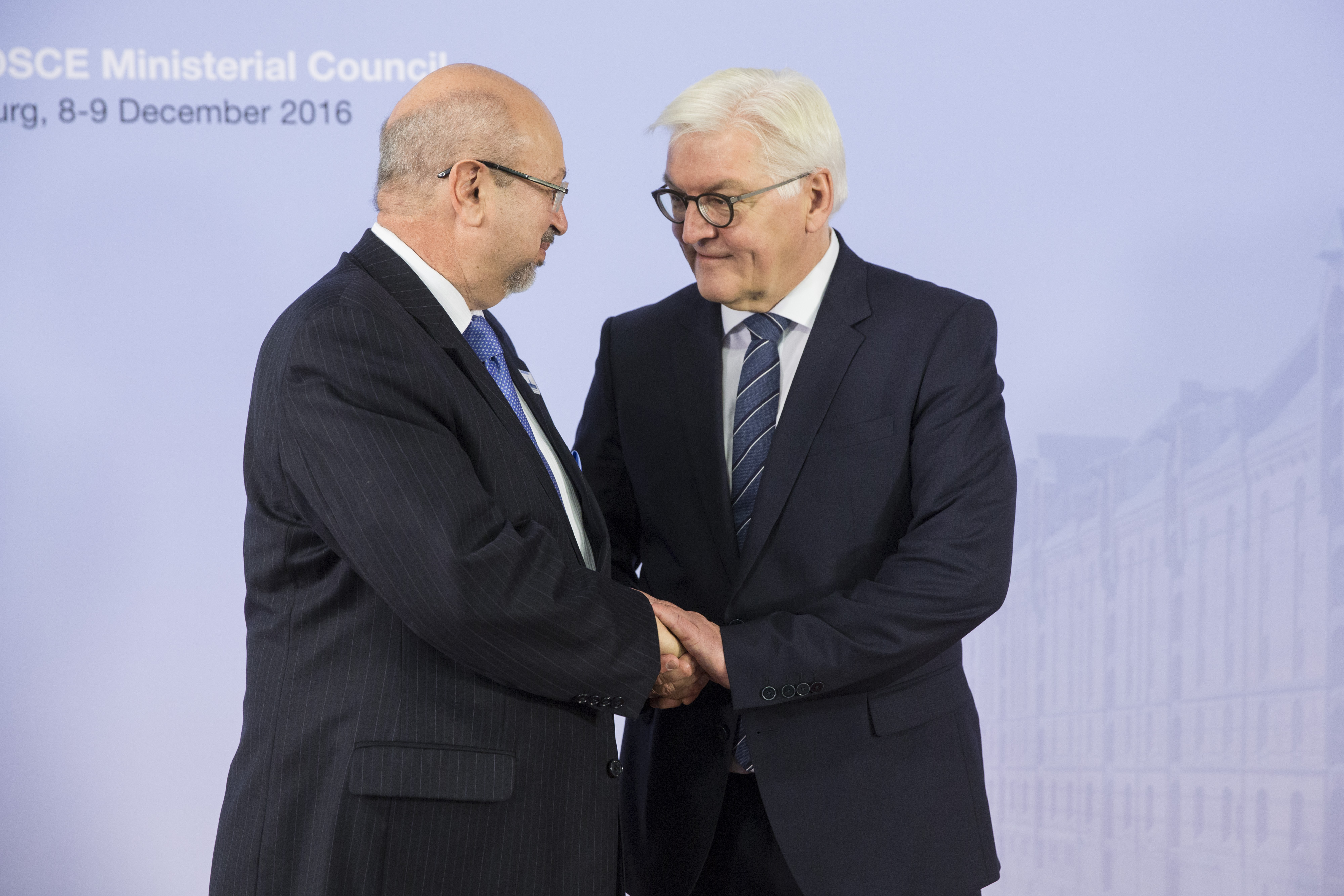 2016 OSCE Chairperson-in-Office and German Foreign Minister Frank-Walter Steinmeier welcomes the OSCE Secretary General Lamberto Zannier to the 23rd OSCE Ministerial Council, Hamburg, 8 December 2016.