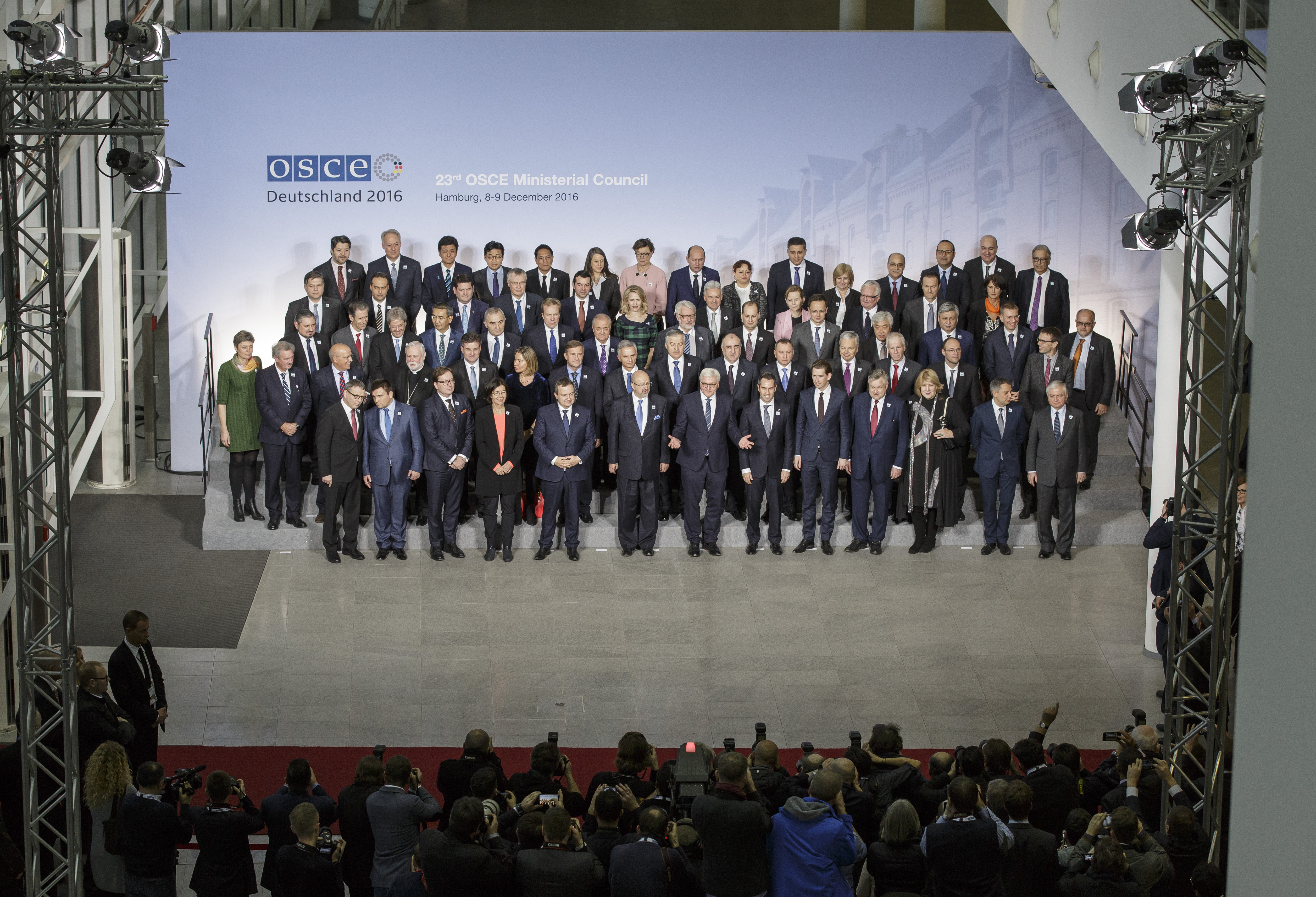 OSCE Foreign Ministers and Heads of Delegations pose for a family photo at the 23rd Ministerial Council in Hamburg, 8 December 2016.