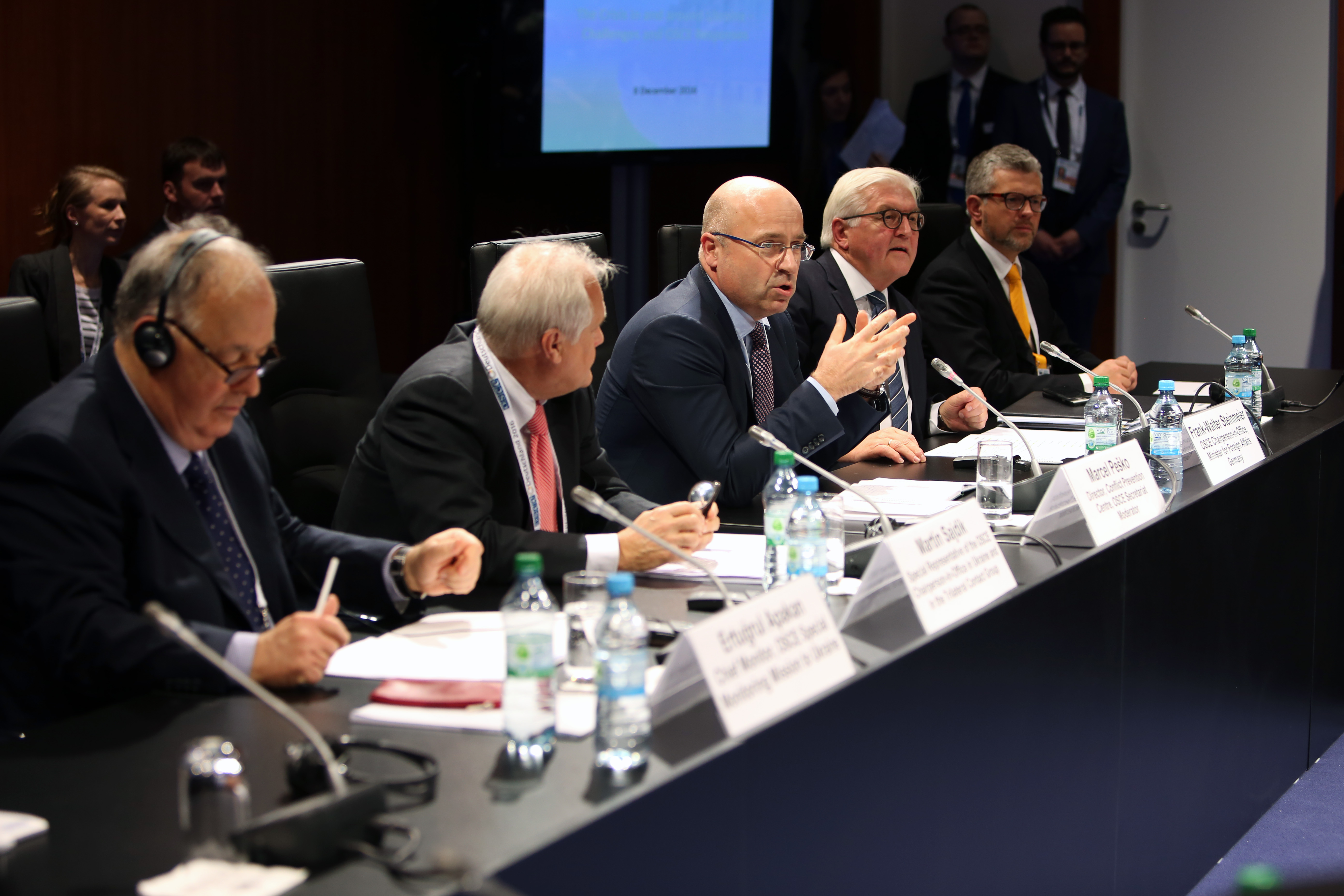 (L-r) Chief Monitor of the OSCE Special Monitoring Mission to Ukraine Ertugrul Apakan, Special Representative of the OSCE Chairperson-in-Office in Ukraine and in the Trilateral Contact Group on the implementation of the peace plan in the East of Ukraine Martin Sajdik, Director of the OSCE Conflict Prevention Centre Marcel Peṧko, and the 2016 OSCE Chairperson-in-Office and German Foreign Minister Frank-Walter Steinmeier at "The Crisis in and around Ukraine - Challenges and OSCE Responses" side event on the margins of the 23rd OSCE Ministerial Council, Hamburg, 8 December 2016.