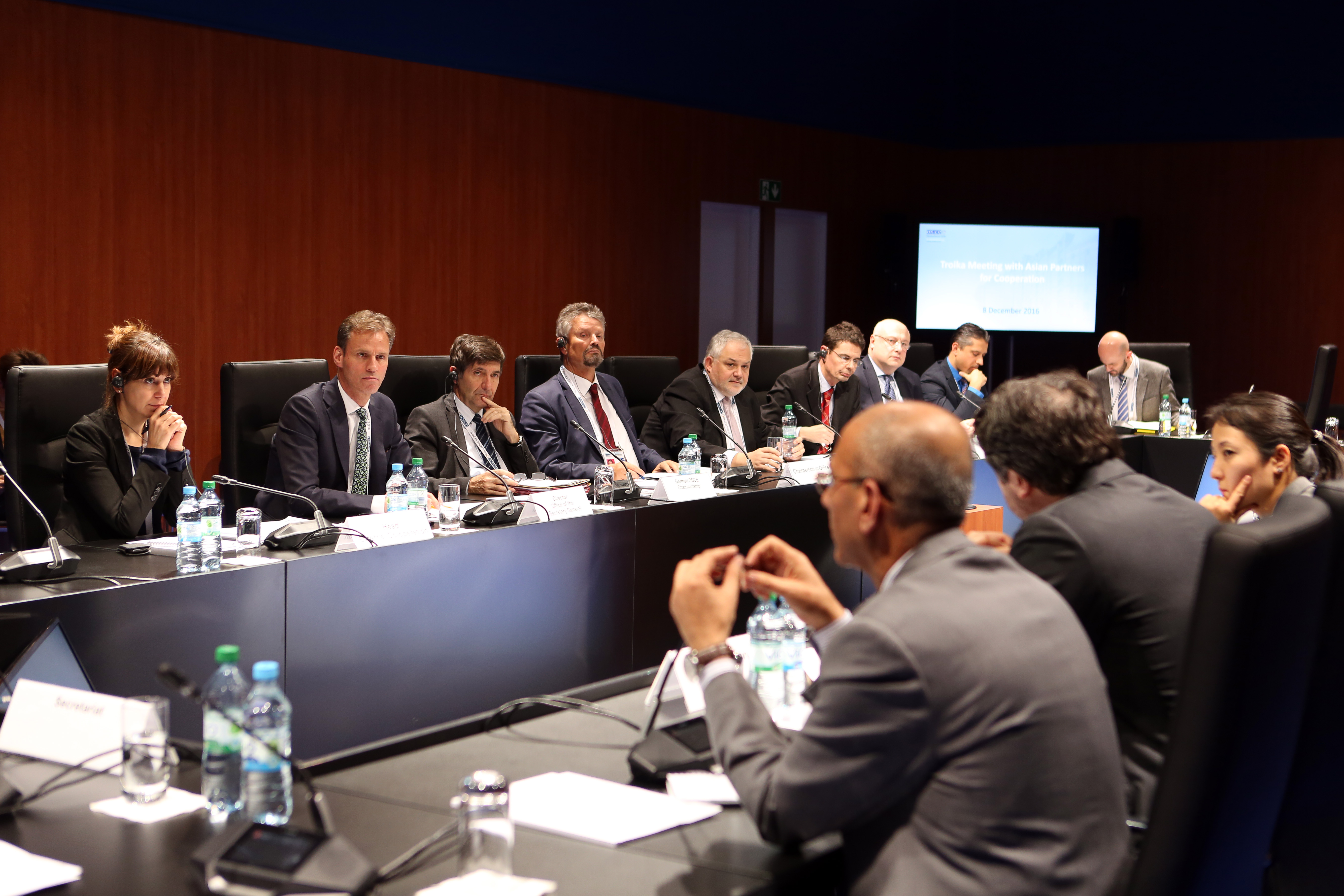 Paul Bekkers, Director of the Office of the OSCE Secretary General, and representatives of the OSCE Ministerial Troika at the meeting with the OSCE Asian Partners for Co-operation on the margins of the 23rd OSCE Ministerial Council, Hamburg, 8 December 2016.
