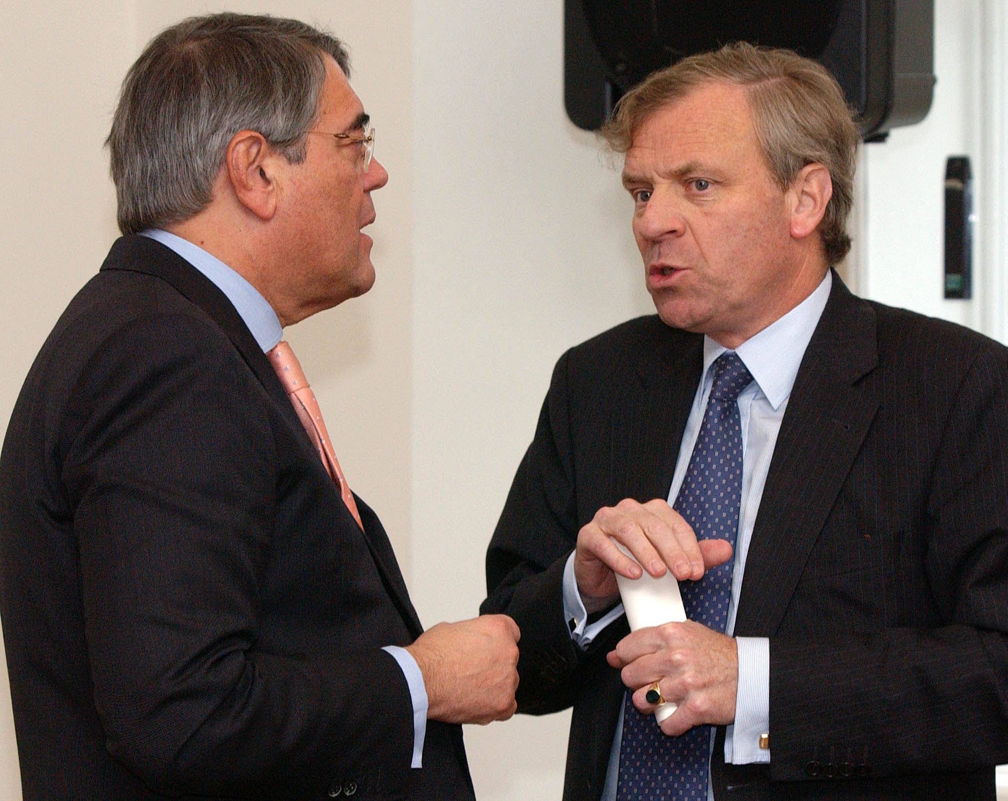 OSCE's Chairman-in-Office, Portuguese Foreign Minister Antonio Martins da Cruz (left) talks with Dutch Foreign Minister Jaap de Hoop Scheffer, Vienna, 5 November 2002.