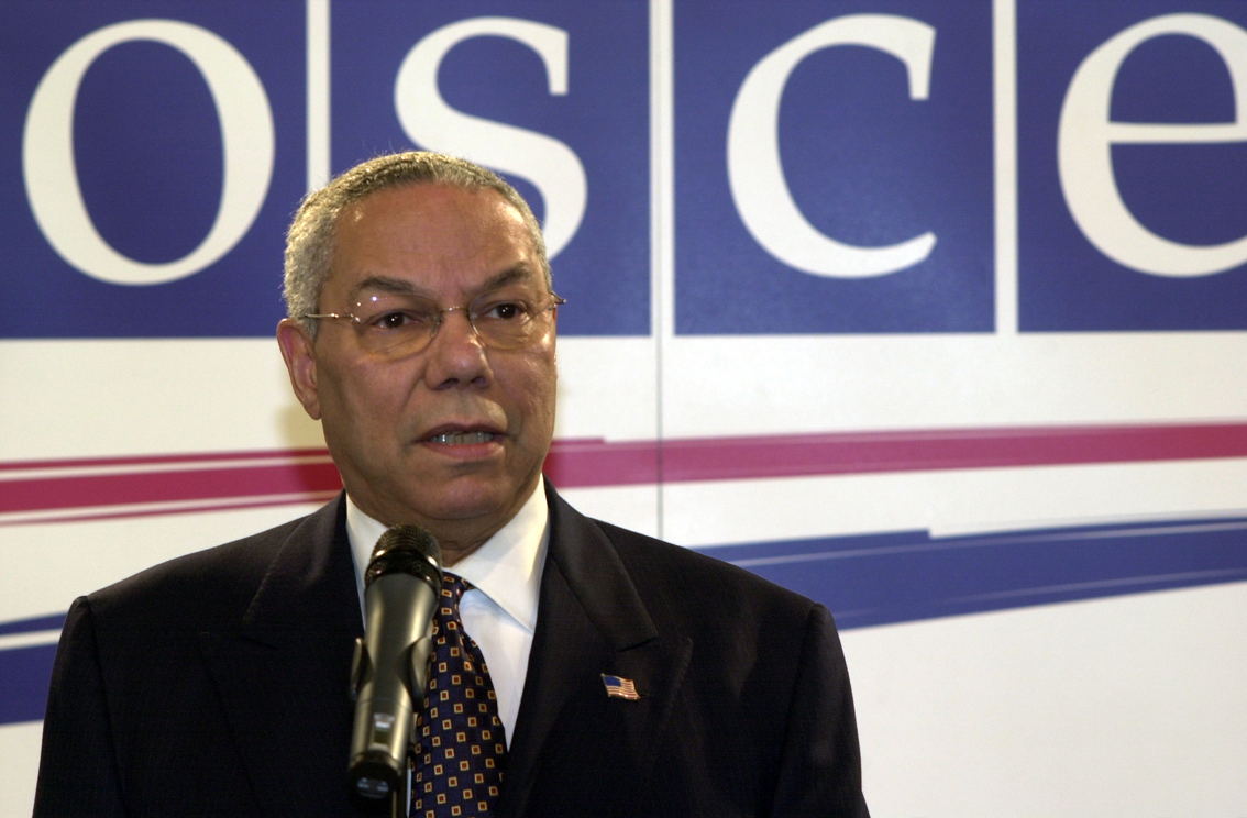 US Secretary of State Colin Powell speaking at the 11th OSCE Ministerial Council in Maastricht, 2 December 2003.