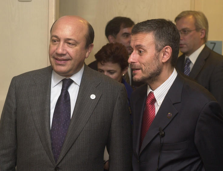 The OSCE Chairman-in-Office in 2004, Bulgarian Foreign Minister Solomon Passy (right), with his Russian colleague Igor Ivanov, at the OSCE Maastricht Ministerial Council, 1 December 2003.