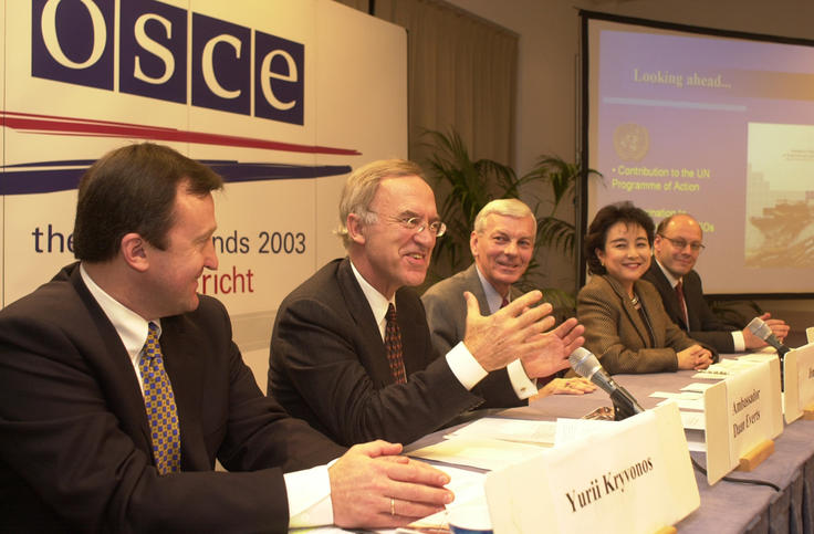 Yurii Kryvonos, Daan Everts, Jim Cox, Kuniko Inoguchi and Peter Batchelor (from left to right) at the presentation of the OSCE Handbook on Small Arms and Light Weapons at the Ministerial Council in Maastrict, 1 December 2003.