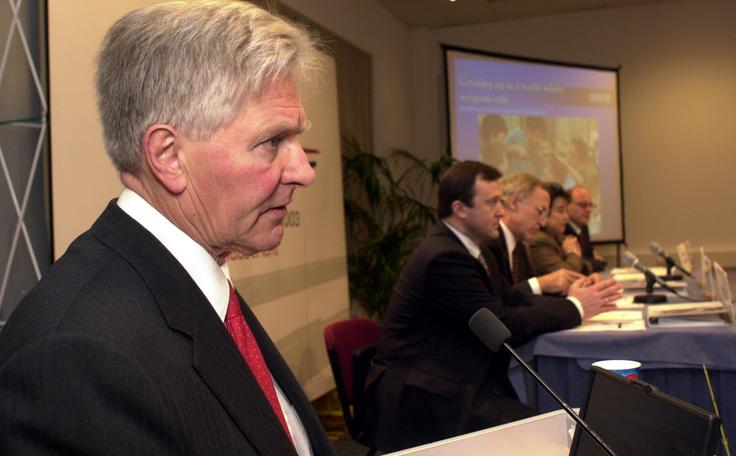 Ambassador Stephan Minikes (left), Head of the US delegation, speaking at the handover ceremony of the OSCE Small Arms and Light Weapons best practice manual, at the OSCE's Maastricht Ministerial Council meeting, 1 December 2003.