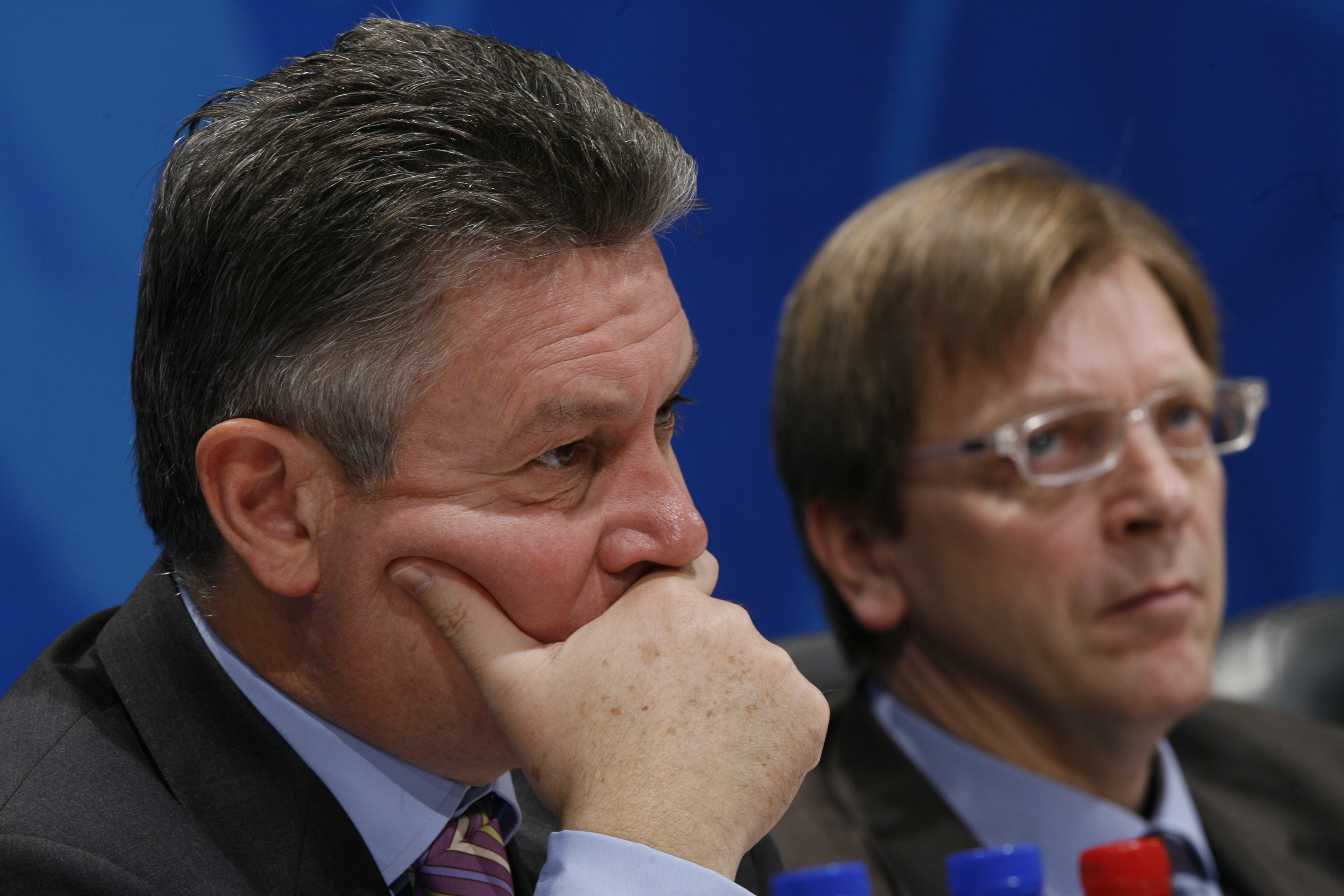 OSCE Chairman-in-Office Karel De Gucht (left) and Belgian Prime Minister Guy Verhofstadt at the opening session of the 14th OSCE Ministerial Council in Brussels, 4 December 2006.