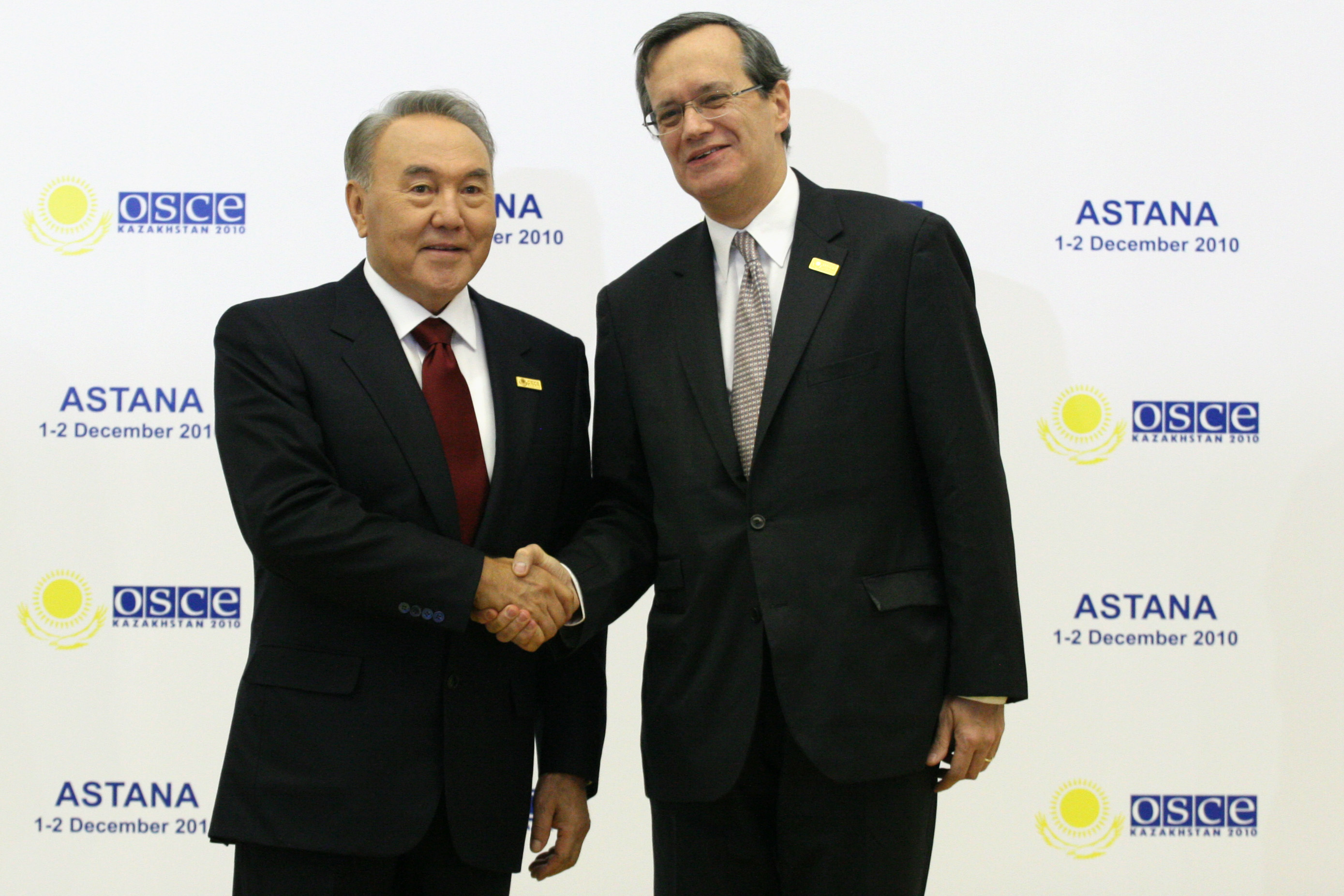 Kazakhstan's President Nursultan Nazarbayev greets OSCE Secretary General Marc Perrin de Brichambaut at the opening of the OSCE Summit in Astana, 1 December 2010.