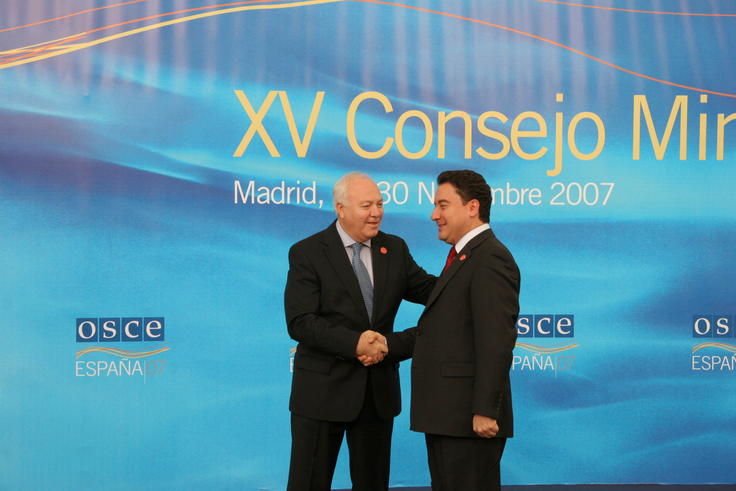 OSCE Chairman-in-Office, Spanish Foreign Minister Miguel Angel Moratinos (left), welcomes Turkey's Minister of Foreign Affairs, Ali Babacan, at the 15th OSCE Ministerial Council in Madrid, 29 November 2007.
