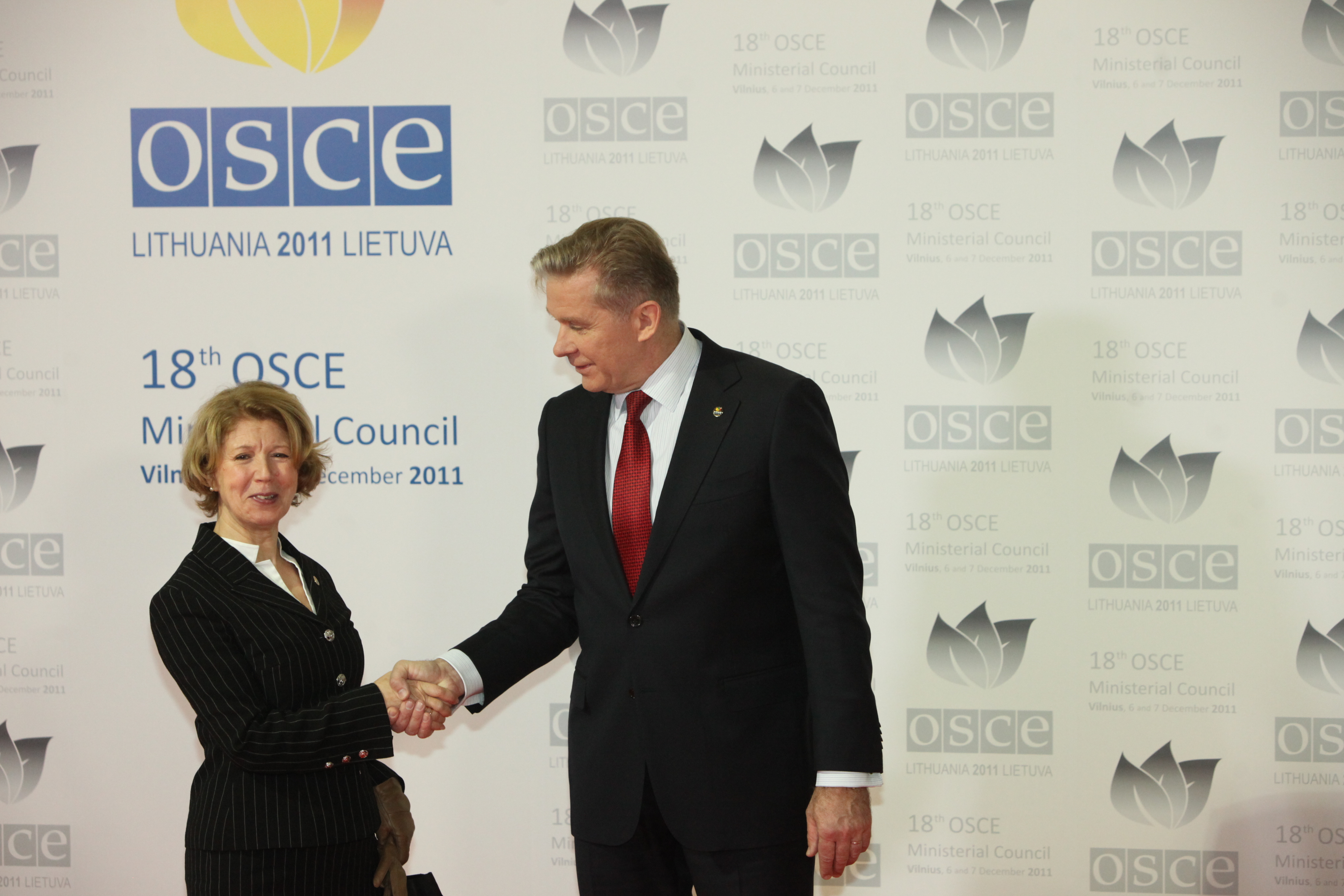The OSCE Chairperson-in-Office, Lithuanian Foreign Minister Audronius Ažubalis, greets Ambassador Taous Feroukhi, Permanent Representative of Algeria in Vienna, at the 18th OSCE Ministerial Council, Vilnius, 6 December 2011.