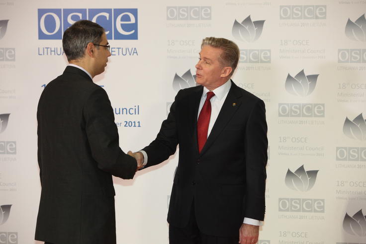 The OSCE Chairperson-in-Office, Lithuanian Foreign Minister Audronius Ažubalis, greets Drahoš Štefánek, Director General for European and Global Affairs, Ministry of Foreign Affairs of the Slovak Republic, at the 18th OSCE Ministerial Council, Vilnius, 6 December 2011.