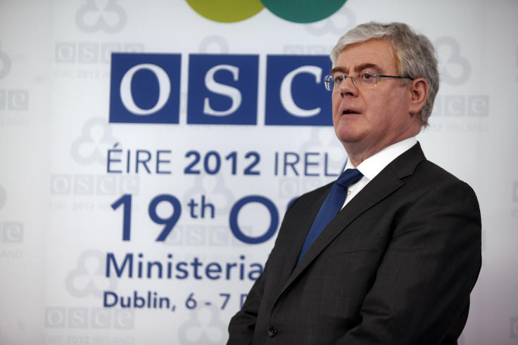 OSCE Chairperson-in-Office, Ireland's Deputy Prime Minister and Minister for Foreign Affairs and Trade, Eamon Gilmore, prepares to greet guests to the 2012 OSCE Ministerial Council in Dublin, 6 December 2012.