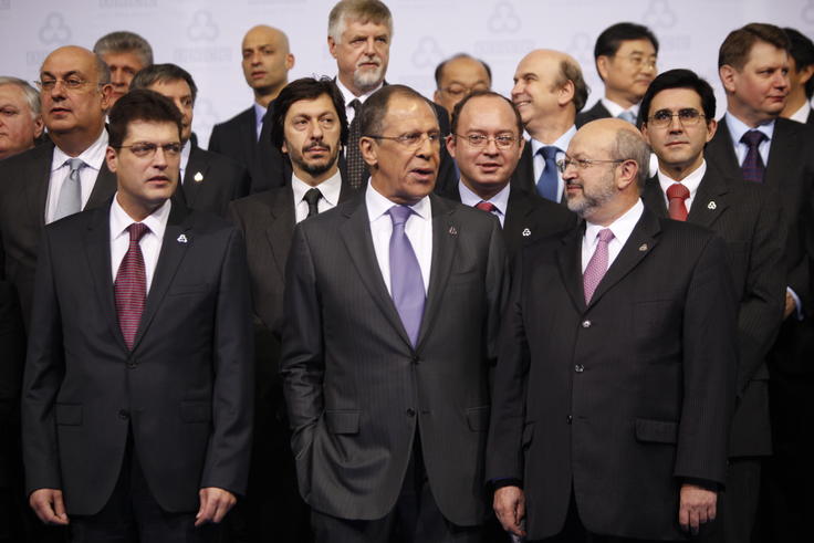 R-l: OSCE Secretary General Lamberto Zannier, Russian Foreign Minister Sergey Lavrov, and Director of the OSCE Office for Democratic Institutions and Human Rights Janez Lenarčič, posing for a family photo at the 2012 OSCE Ministerial Council in Dublin, 6 December 2012.
