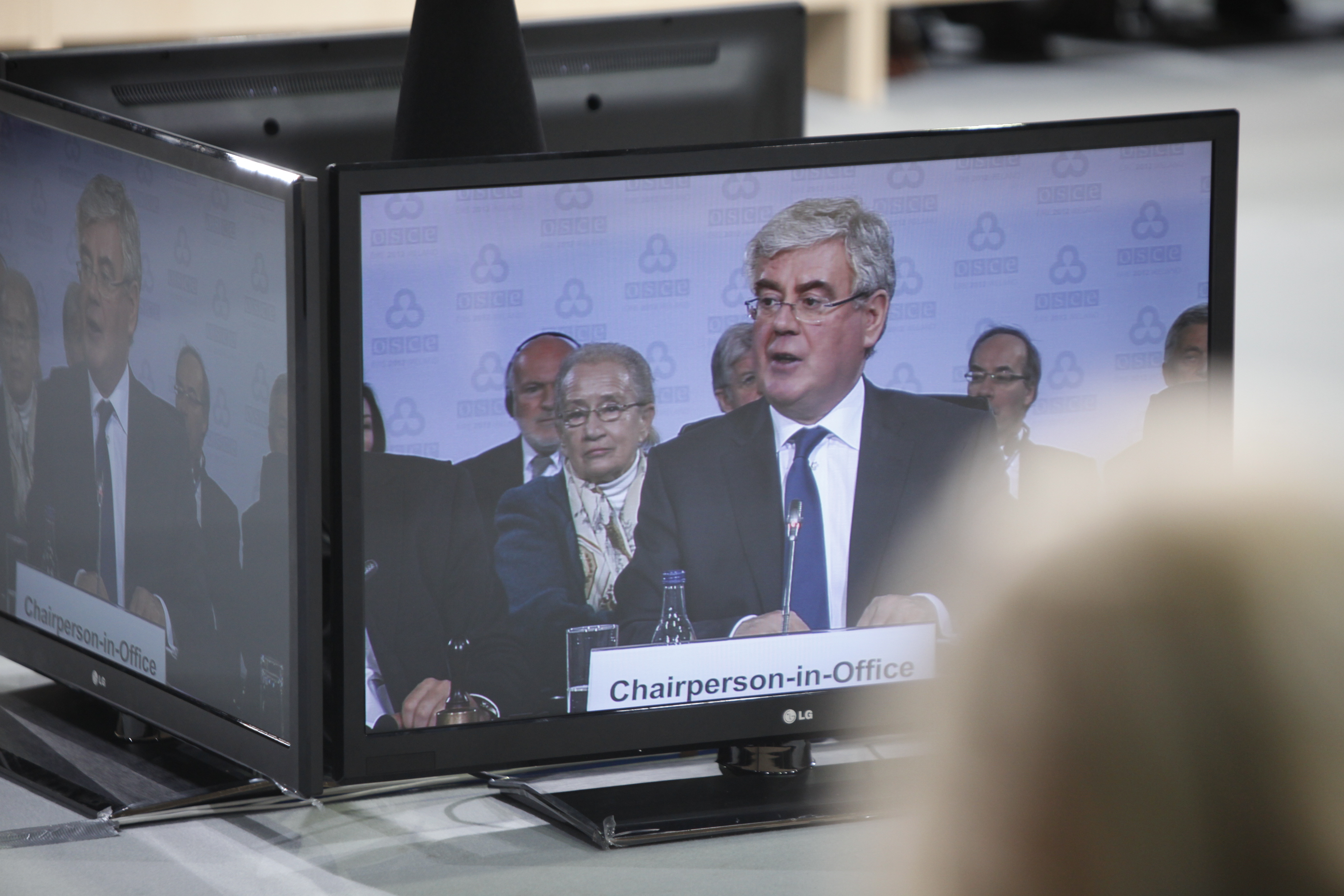 OSCE Chairperson-in-Office, Ireland's Deputy Prime Minister and Minister for Foreign Affairs and Trade, Eamon Gilmore, replayed through a video screen at the opening the 2012 OSCE Ministerial Council in Dublin, 6 December 2012.