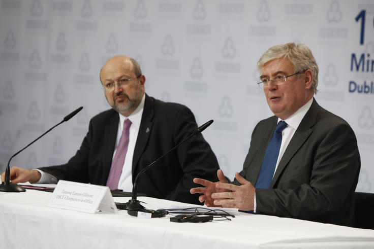 OSCE Chairperson-in-Office, Ireland's Deputy Prime Minister and Minister for Foreign Affairs and Trade, Eamon Gilmore (r), alongside OSCE Secretary General Lamberto Zannier, announcing a decision on "Helsinki +40" - a roadmap for the OSCE - at the 2012 OSCE Ministerial Council, Dublin, 6 December 2012.