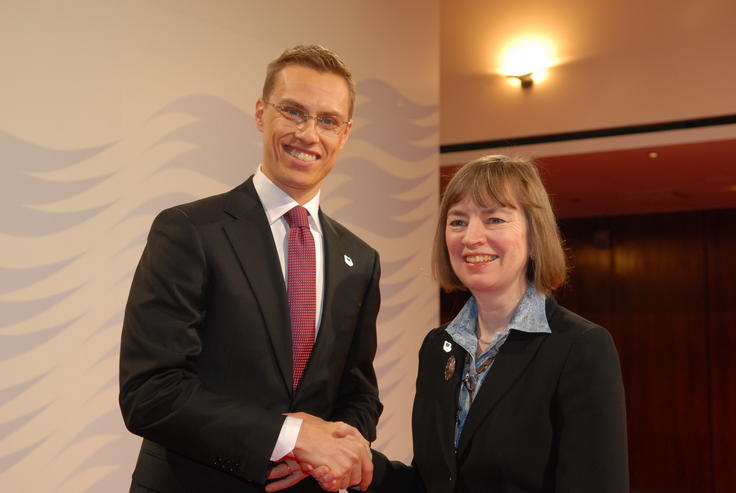 OSCE Chairman-in-Office, Finnish Foreign Minister Alexander Stubb (left), welcomes Colleen Swords, Canadian Assistant Deputy Minister for Security, at the 16th OSCE Ministerial Council in Helsinki, 4 December 2008.