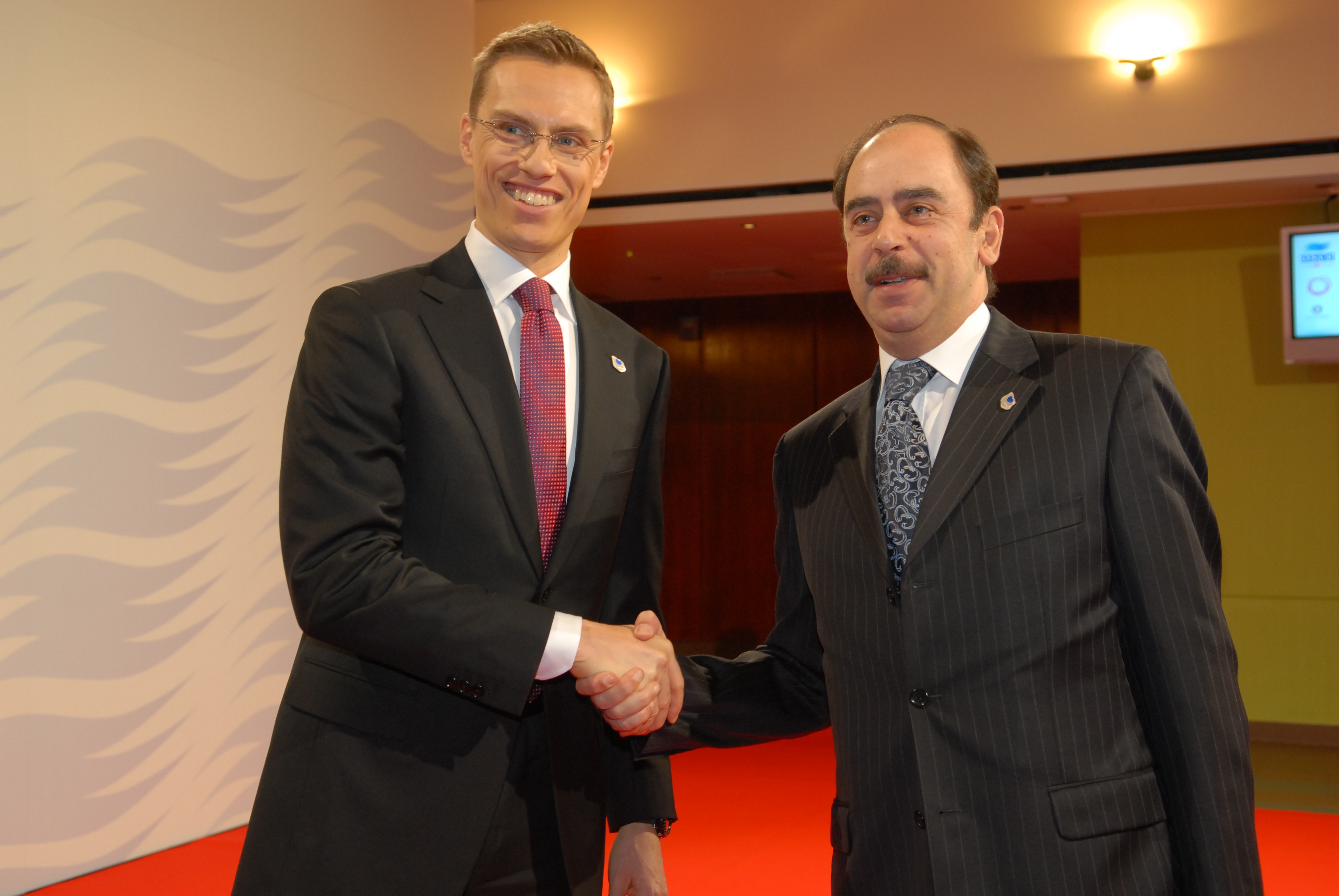 OSCE Chairman-in-Office, Finnish Foreign Minister Alexander Stubb (left), welcomes Ali Ben Malek, Charge d'Affairs of Tunisia in Finland, at the 16th OSCE Ministerial Council in Helsinki, 4 December 2008.