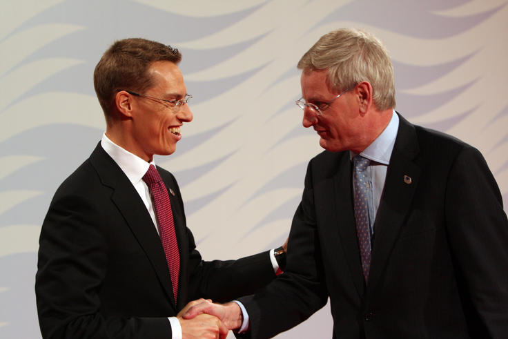 OSCE Chairman-in-Office, Finnish Foreign Minister Alexander Stubb (left), with Swedish Foreign Minister Carl Bildt, at the 16th OSCE Ministerial Council in Helsinki, 4 December 2008.