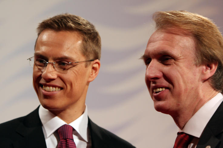 OSCE Chairman-in-Office, Finnish Foreign Minister Alexander Stubb (left), welcomes Ukrainian Foreign Minister Volodymyr Ogryzko at the 16th OSCE Ministerial Council in Helsinki, 4 December 2008.