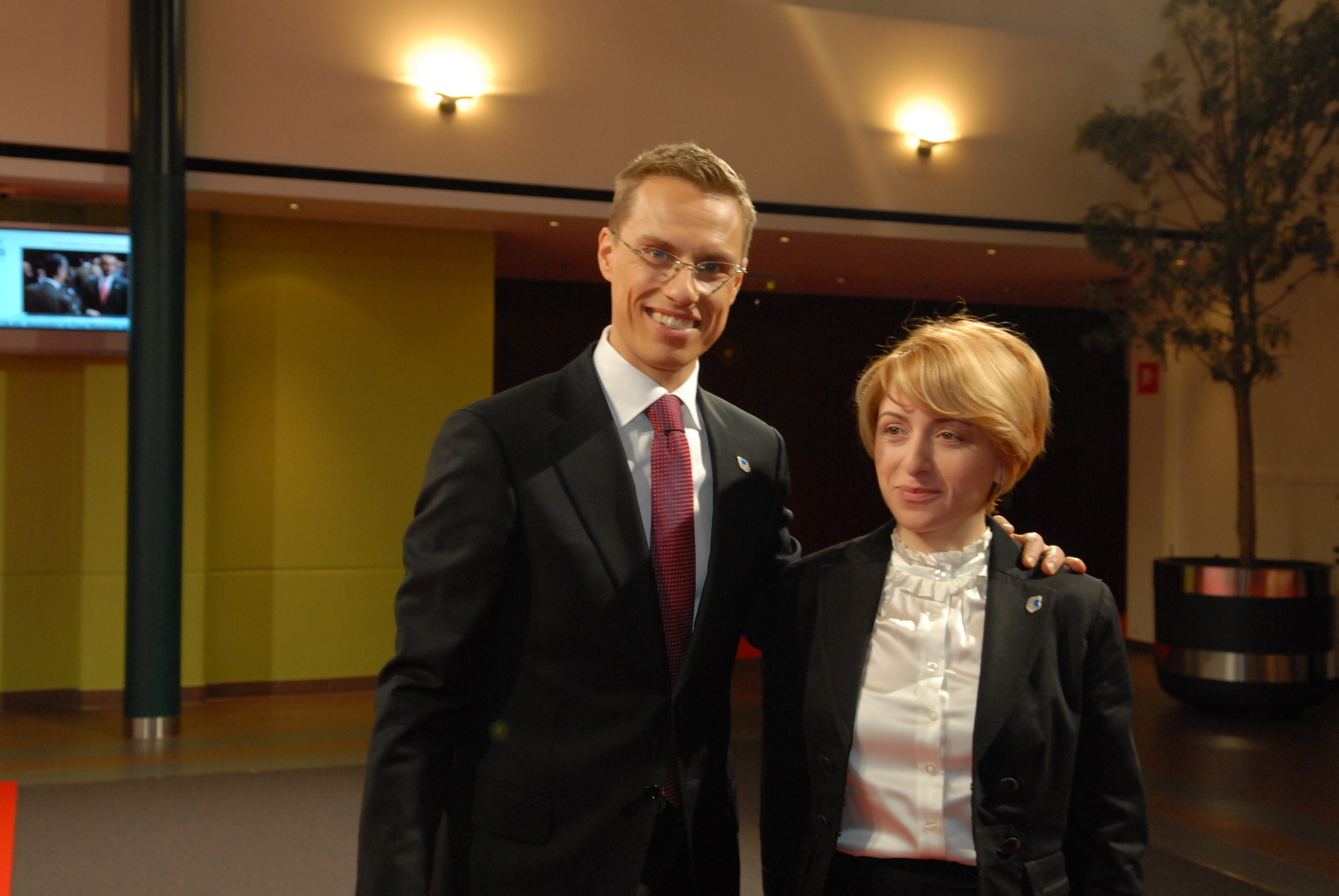 OSCE Chairman-in-Office, Finnish Foreign Minister Alexander Stubb (left), welcomes Eka Tkeshelashvili, Minister of Foreign Affairs of Georgia, at the 16th OSCE Ministerial Council in Helsinki, 4 December 2008.