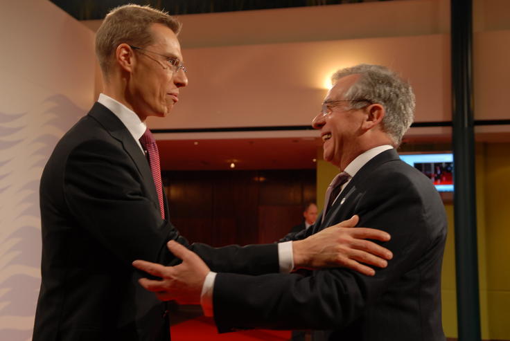OSCE Chairman-in-Office, Finnish Foreign Minister Alexander Stubb (left), welcomes Eneko Landaburu, Director General for External Relations at the European Commission, at the 16th OSCE Ministerial Council in Helsinki, 4 December 2008.