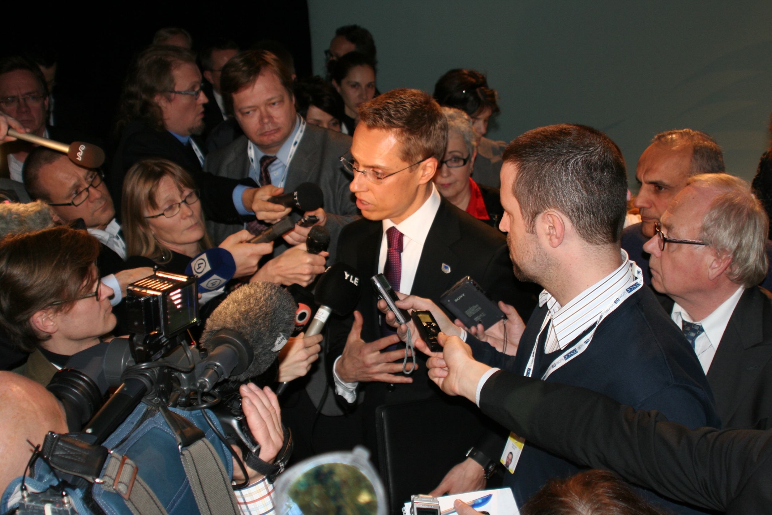 Chairman-in-Office, Finnish Foreign Minister Alexander Stubb (centre), speaks to journalists at the 16th OSCE Ministerial Council in Helsinki, 4 December 2008.
