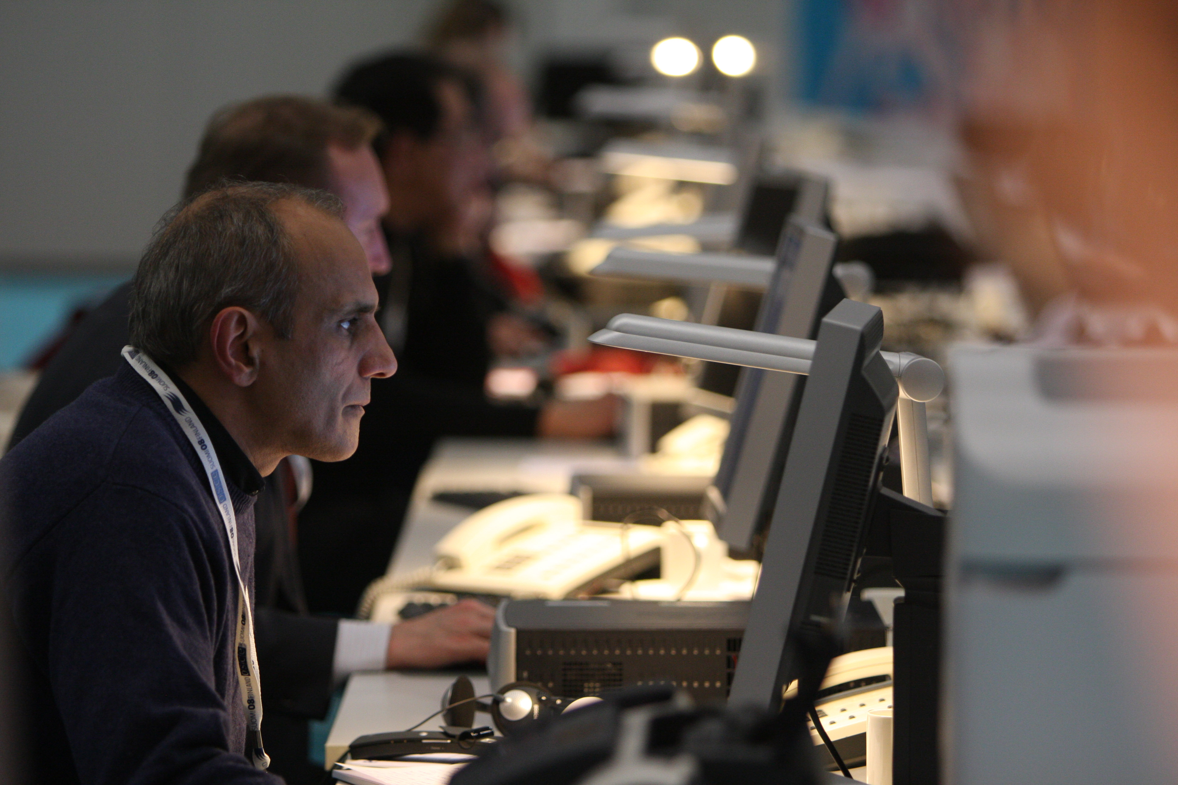 Journalists at work in the press centre at the 16th OSCE Ministerial Council, Helsinki, 4 December 2008. Some 300 journalists are in the capital of Finland to cover the event.