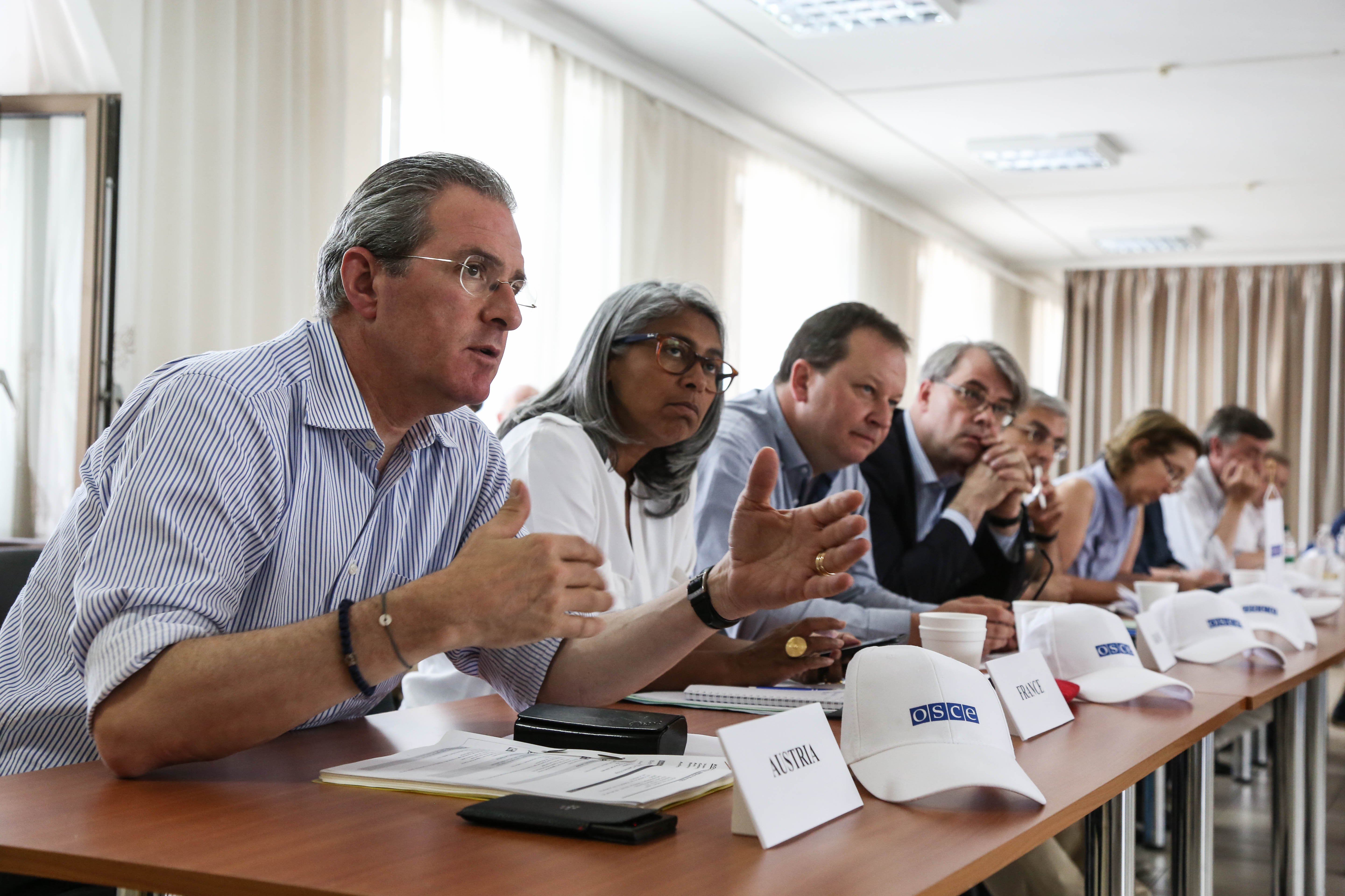 Heads of Delegations of OSCE participating States discuss during a field visit in 2017.