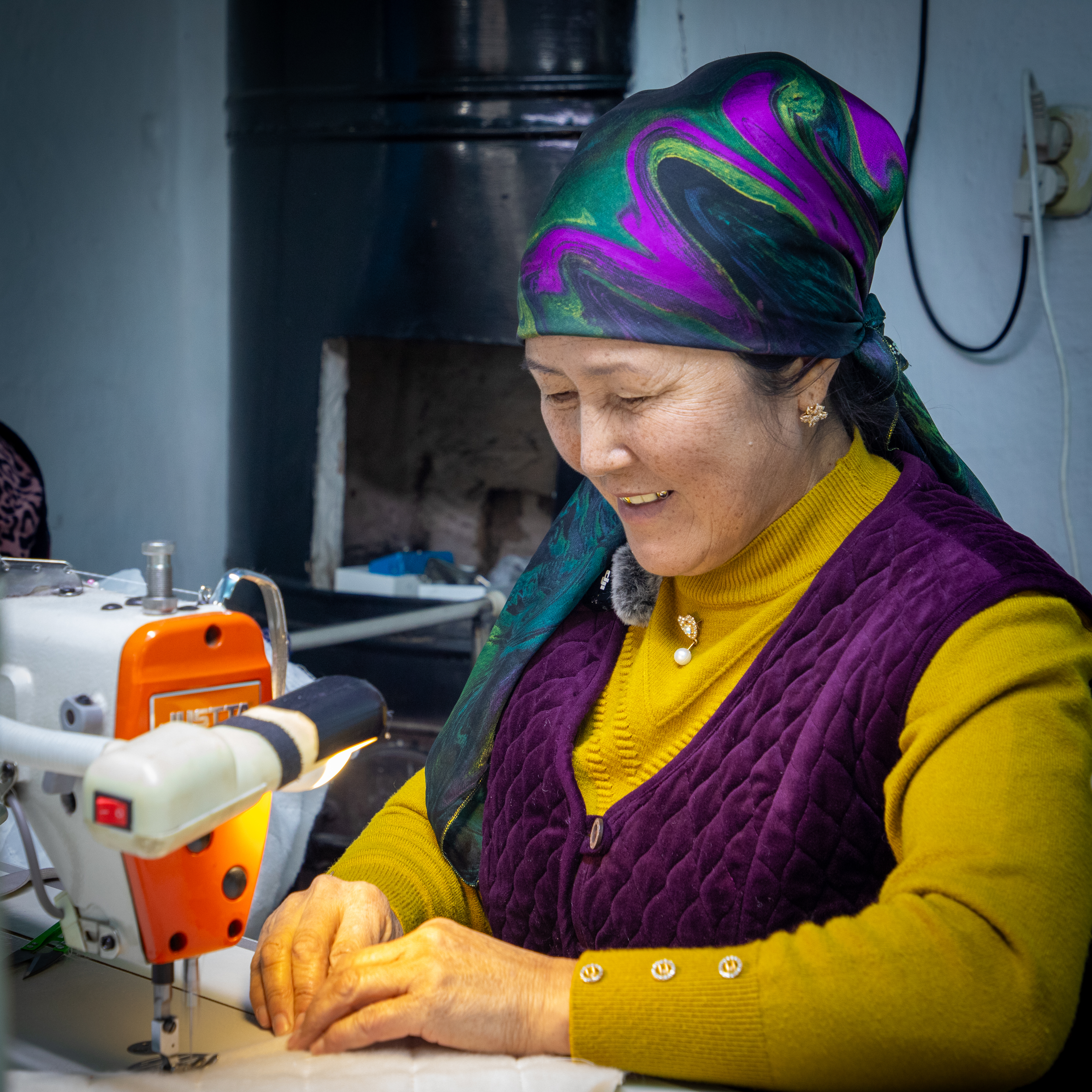 Venera Kydykova enjoying the creative process on a machine provided by the OSCE, Issyk-Kul region, 25 November 2024.