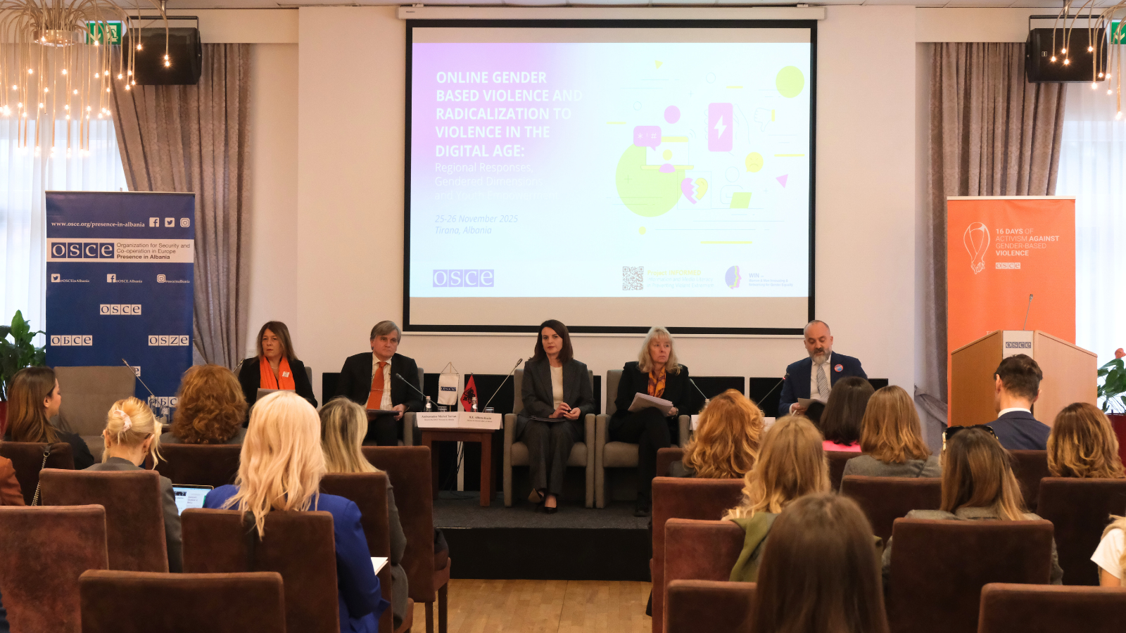 A high-level opening panel of the two-day Regional South-Eastern Europe Conference on Online Gender-Based Violence and Radicalization to Violence, organized by the OSCE Secretariat and the OSCE Presence in Albania.