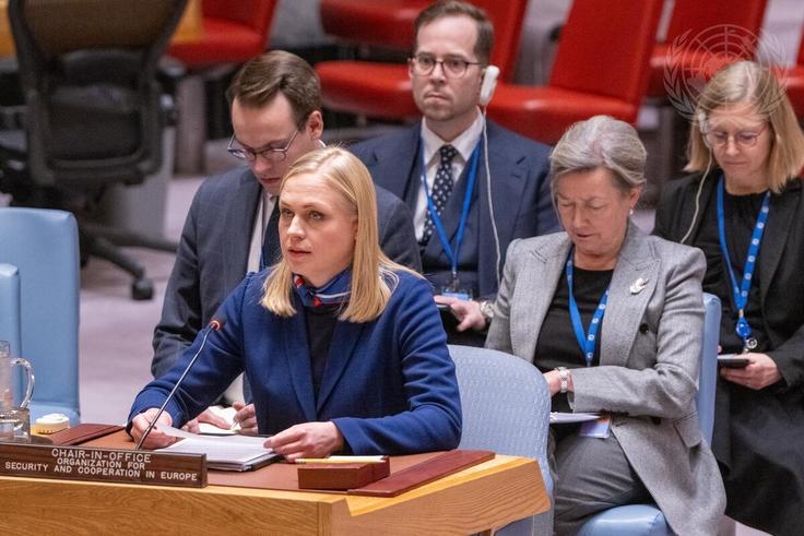 The OSCE Chairperson-in-Office, Minister for Foreign Affairs of Finland Elina Valtonen, addresses the United Nations Security Council, New York, 8 December