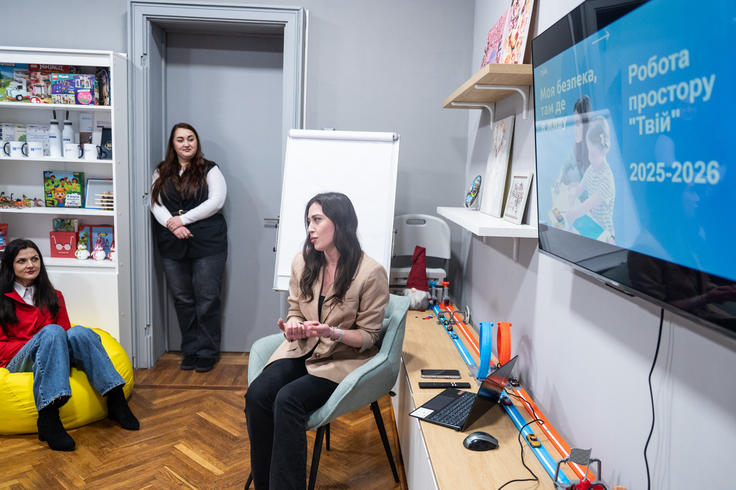 Natalia Nahorniak, a social worker of “Tvii/Yours” space in Vinnytsia, presents outcomes of psychosocial assistance provided to children for the past year at a meeting devoted to handover of OSCE-supported spaces for kids to local authorities. Vinnytsia, Ukraine, 26 February 2026.